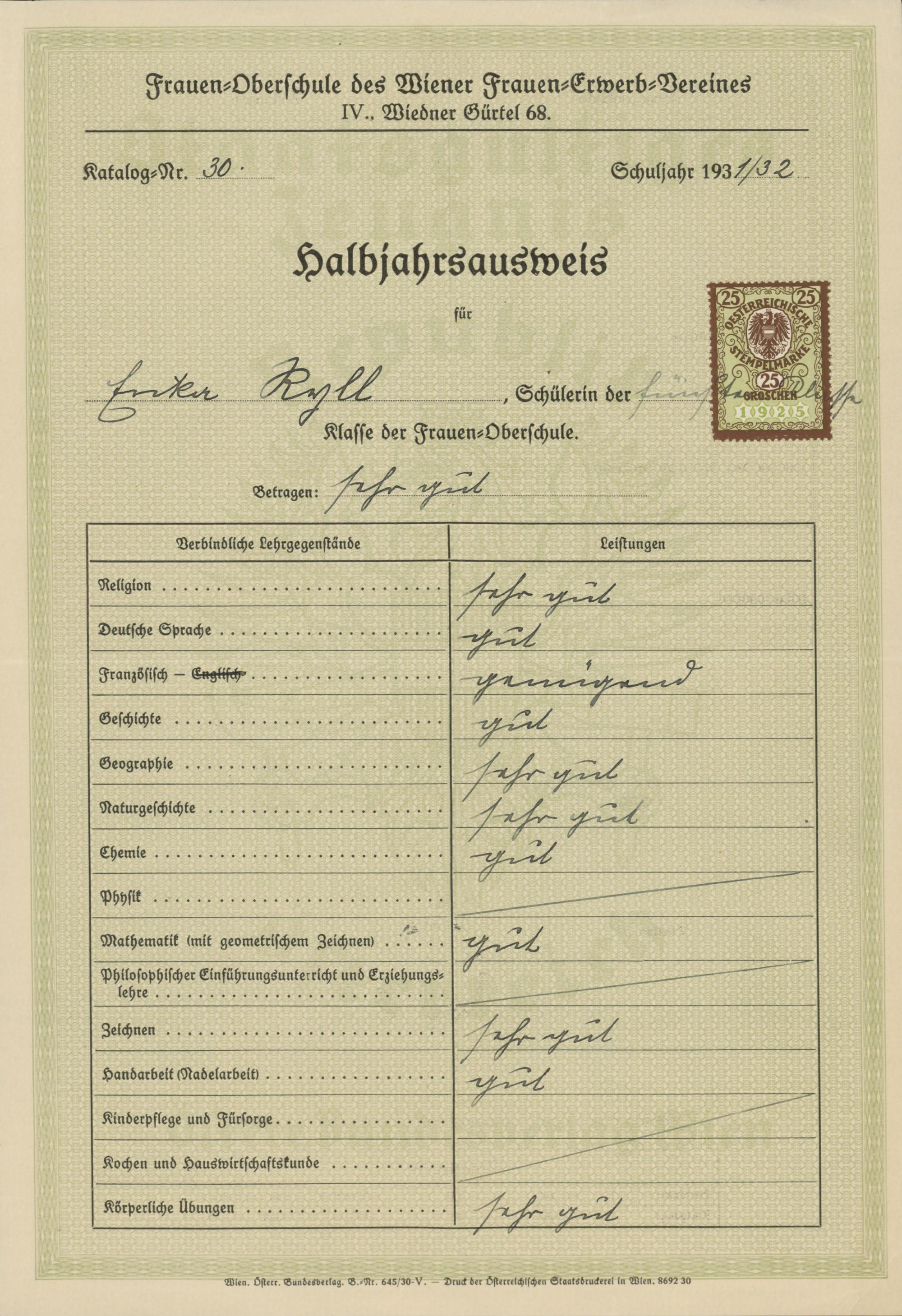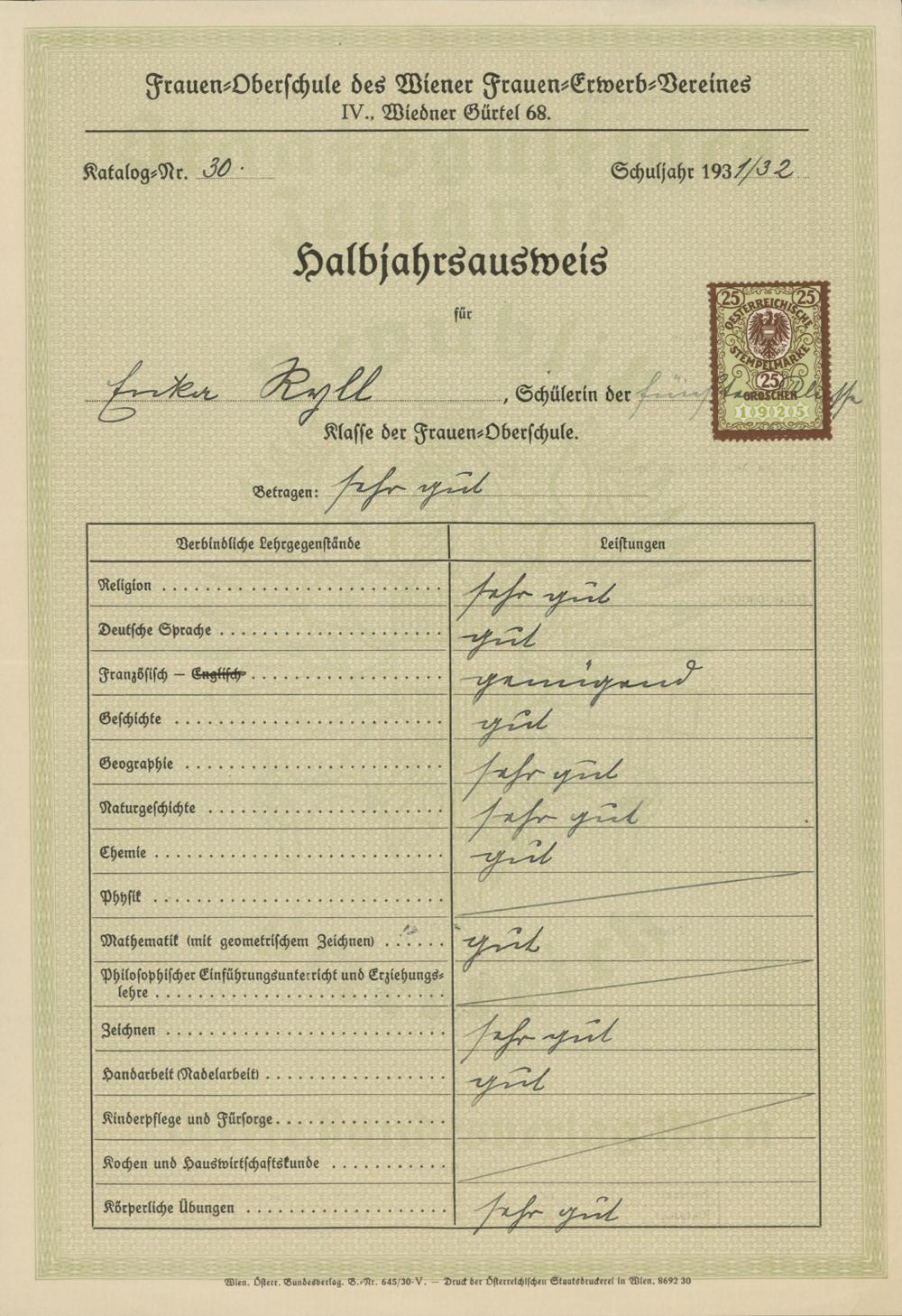 Zeugnis Frauen-Oberschule des Wiener Frauen-Erwerb-Vereins