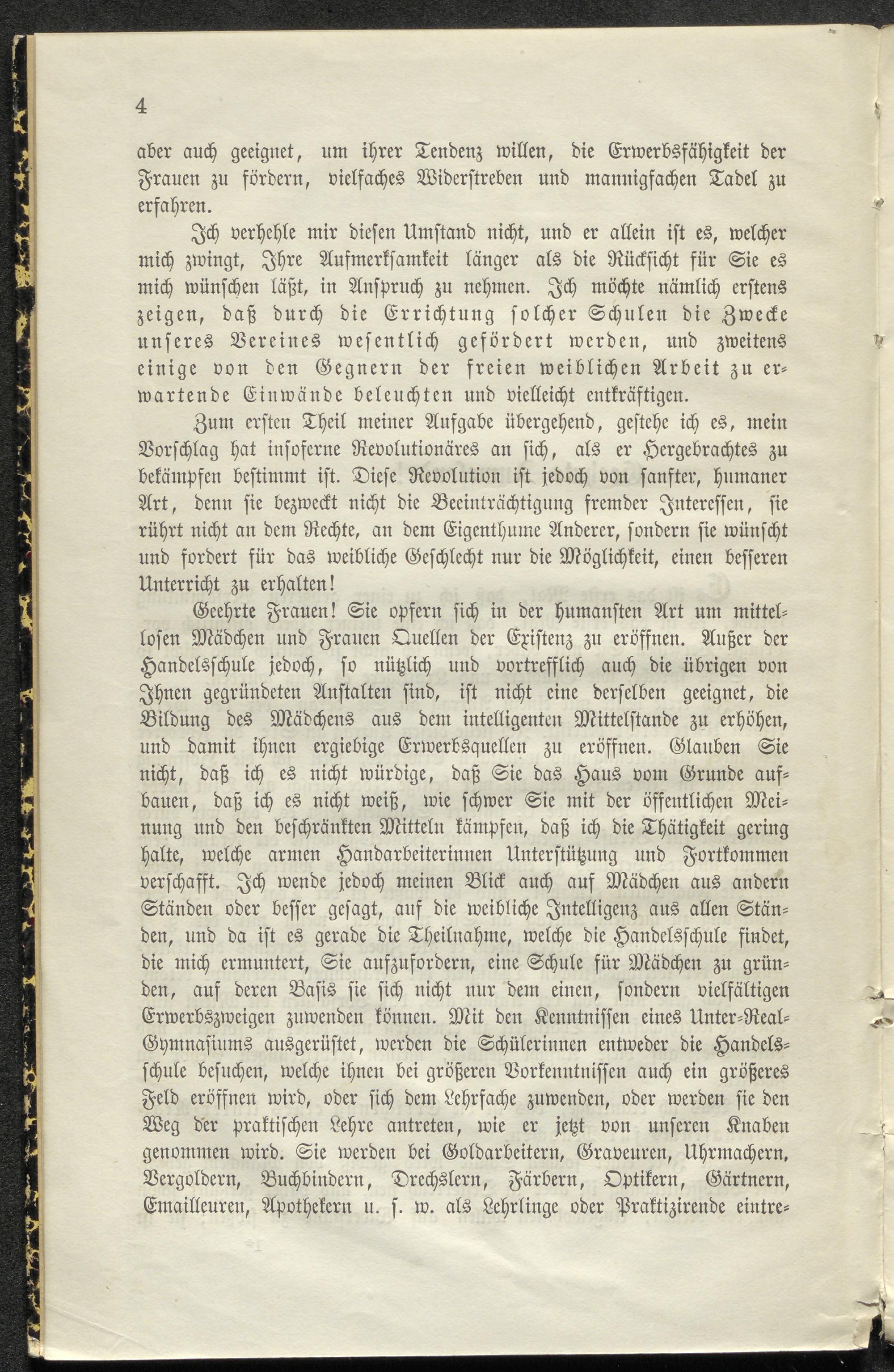 Geehrte Frauen! Sie opfern sich in der humansten Art um mittellosen Mädchen und Frauen Quellen der Existenz zu eröffnen. Außer der Handelsschule jedoch, so nützlich und vortrefflich auch die übrigen von Ihnen gegründeten Anstalten sind, ist nicht eine derselben geeignet, die Bildung des Mädchens aus dem intelligenten Mittelstände zu erhöhen, und damit ihnen ergiebige Erwerbsquellen zu eröffnen. Glauben Sie nicht, daß ich es nicht würdige, daß Sie das Haus vom Grunde ausbauen, daß ich es nicht weiß, wie schwer Sie mit der öffentlichen Meinung und den beschränkten Mitteln kämpfen, daß ich die Thätigkeit gering halte, welche armen Handarbeiterinnen Unterstützung und Fortkommen verschafft. Ich wende jedoch meinen Blick auch auf Mädchen aus andern Ständen oder besser gesagt, auf die weibliche Intelligenz aus allen Ständen, und da ist es gerade die Theilnahme, welche die Handelsschule findet, die mich ermuntert, Sie aufzufordern, eine Schule für Mädchen zu gründen, auf deren Basis sie sich nicht nur dem einen, sondern vielfältigen Erwerbszweigen zuwenden können. Mit den Kenntnissen eines Unter-Real-