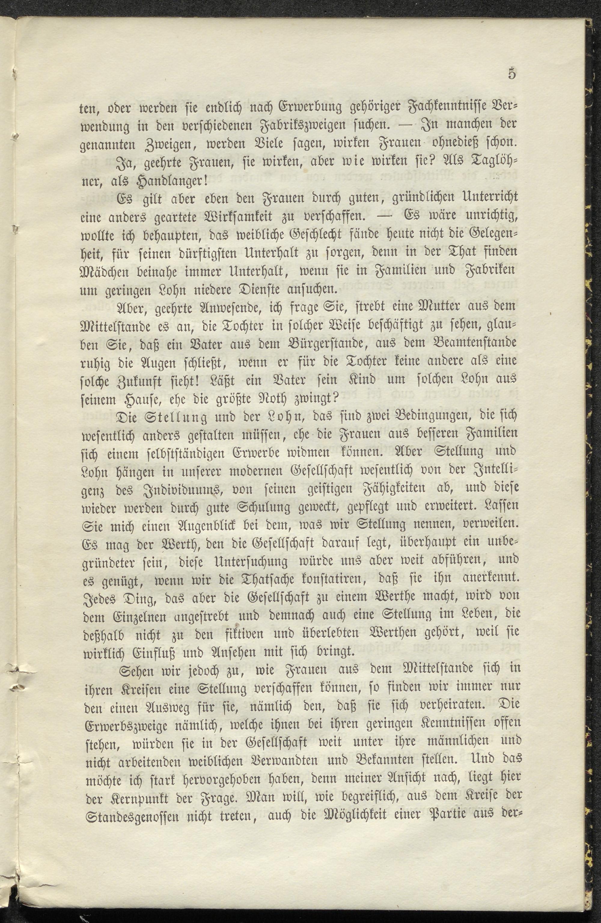 Aber, geehrte Anwesende, ich frage Sie, strebt eine Mutter aus dem Mittelstände es an, die Tochter in solcher Weise beschäftigt zu sehen, glauben Sie, daß ein Vater aus dem Bürgerstande, aus dem Beamtenstande ruhig die Augen schließt, wenn er für die Tochter keine andere als eine solche Zukunft sieht! Läßt ein Vater sein Kind um solchen Lohn aus seinem Hause, ehe die größte Noth zwingt?