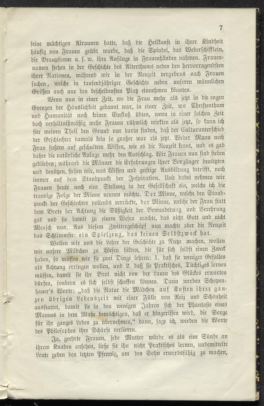 Wollen wir uns die Lehre der Geschichte zu Nutze machen, wollen wir unsere Mädchen zu Wesen bilden, die für sich selbst einen Zweck haben, so müssen wir sie zwei Dinge lehren: 1. daß sie weniger Gefallen als Achtung erringen wollen, und 2. daß sie Praktisches, Tüchtiges lernen müssen, damit sie ihr Brot nicht von der Laune des Glückes erwarten dürfen, sondern es sich selbst schaffen können. Dann werden Schopenhauers Worte: „daß die Natur die Mädchen auf Kosten ihrer ganzen übrigen Lebenszeit mit einer Fülle von Reiz und Schönheit ausstattet, damit sie in den wenigen Jahren sich der Phantasie eines Mannes in dem Maße bemächtigen, daß er hingerissen wird, die Sorge für ihr ganzes Leben zu übernehmen," dann, sage ich, werden die Worte des Philosophen ihre Schärfe verlieren.
