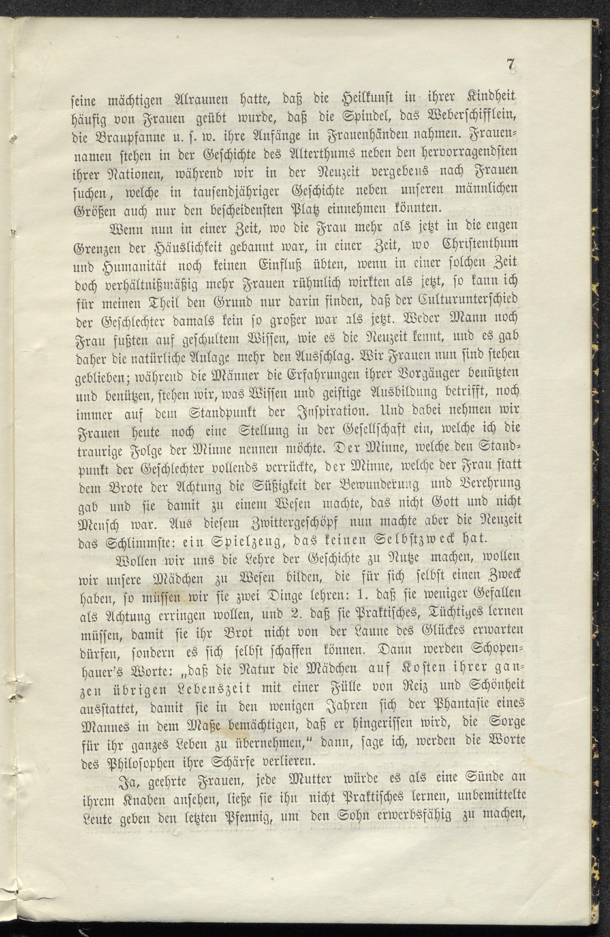 seine mächtigen Alraunen hatte, daß die Heilkunst in ihrer Kindheit häufig von Frauen geübt wurde, daß die Spindel, das Weberschifflein, die Braupfanne u. s. w. ihre Anfänge in Frauenhänden nahmen. Frauen- namen stehen in der Geschichte des Alterthums neben den hervorragendsten ihrer Nationen, während wir in der Neuzeit vergebens nach Frauen suchen, welche in tausendjähriger Geschichte neben unseren männlichen Größen auch nur den bescheidensten Platz einnehmen könnten.