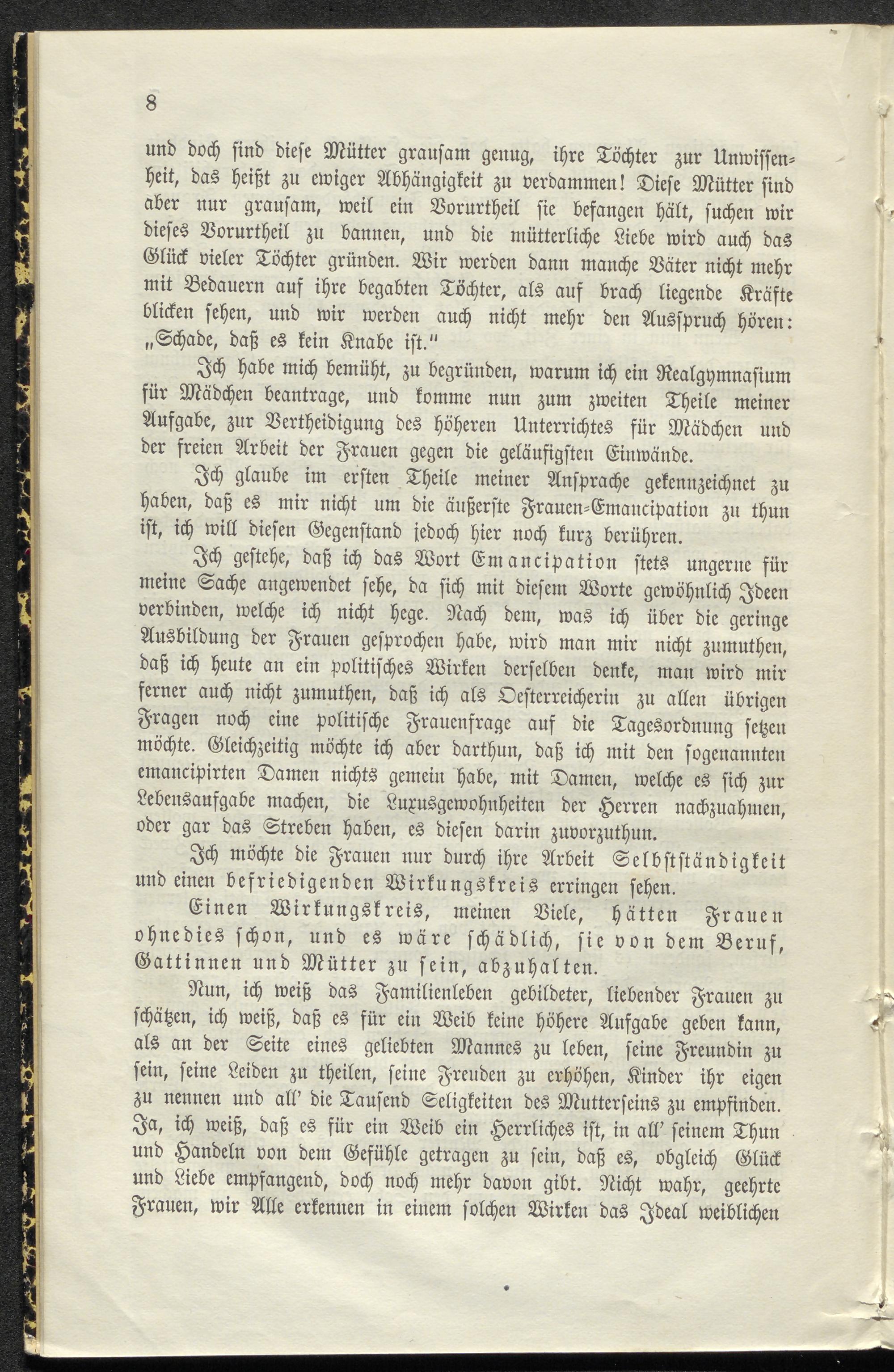 Ich habe mich bemüht, zu begründen, warum ich ein Realgymnasium für Mädchen beantrage, und komme nun zum zweiten Theile meiner Aufgabe, zur Vertheidigung des höheren Unterrichtes für Mädchen und der freien Arbeit der Frauen gegen die geläufigsten Einwände.