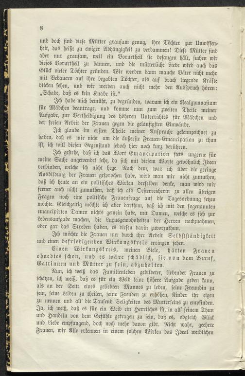 Ich gestehe, daß ich das Wort Emancipation stets ungerne für meine Sache angewendet sehe, da sich mit diesem Worte gewöhnlich Ideen verbinden, welche ich nicht hege. Nach dem, was ich über die geringe Ausbildung der Frauen gesprochen habe, wird man mir nicht zumuthen, daß ich heute an ein politisches Wirken derselben denke, man wird mir ferner auch nicht zumuthen, daß ich als Oesterreicherin zu allen übrigen Fragen noch eine politische Frauenfrage auf die Tagesordnung setzen möchte. Gleichzeitig möchte ich aber darthun, daß ich mit den sogenannten emancipirten Damen nichts gemein habe, mit Damen, welche es sich zur Lebensaufgabe machen, die Luxusgewohnheiten der Herren nachzuahmen, oder gar das Streben haben, es diesen darin zuvorzuthun.