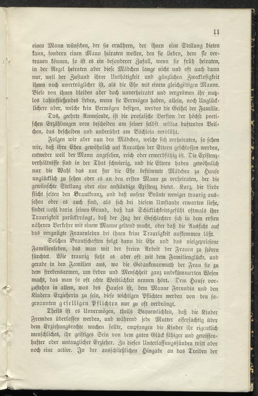 einen Mann wünschen, der sie ernähren, der ihnen eine Stellung bieten kann, sondern einen Mann heiraten wollen, den sie lieben, dem sie vertrauen können, so ist es ein besonderer Zufall, wenn sie früh heiraten, in der Regel heiraten aber diese Mädchen lange nicht und oft auch dann nur, weil der Zustand ihrer Unthätigkeit und gänzlichen Zwecklosigkeit ihnen noch unerträglicher ist, als die Ehe mit einem gleichgiltigen Manne. Viele von ihnen bleiben aber doch unverheiratet und vergrämeu ihr nutzlos dahinfließendes Leben, wenn sie Vermögen haben, allein, noch Unglücklichere aber, welche kein Vermögen besitzen, werden die Geißel der Familie.