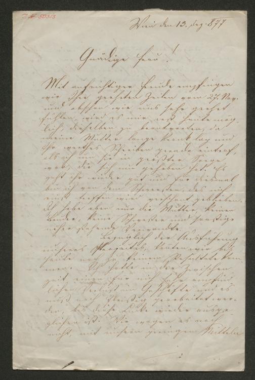 Wien, den 13. Dez. [1]877 Gnädige Frau! Mit aufrichtiger Freude empfingen wir Ihre geehrten Zeilen zum 27. Nov. und obschon wir uns sehr geehrt fühlen, wird es mir erst heute mög¬ lich, dieselben zu beantworten, da meine Mutter lange krank lag und Ihr werthes Schreiben gerade eintraf, als ich um sie in größter Sorge war, die sich nun gehoben hat. Es geht ihr wieder gut und für diesmal bin ich von dem Schwersten, daß mich einst treffen wird, verschont geblieben. Ich habe aber nur die Mutter, keinen Bruder, keine Schwester und sonstiger näher stehende Verwandte. Bezüglich der Ausführung unseres Projectes, konnten wir bis heute noch zu keinem Resultate kom¬ men. Ich hatte in der Zwischen¬ zeit einen für mich sehr empfind¬ lichen Verlust im Geschäfte und es muß noch fleißig gearbeitet wer¬ den, bis diese Lücke wieder ausge¬ glichen ist. Wir wagen es noch nicht, mit unseren geringen Mitteln