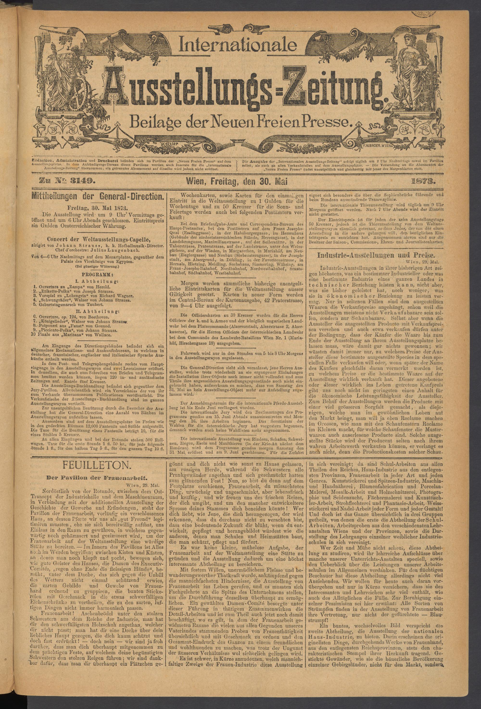 Die Ausgabe der ,,Internationalen Ausstellungs-Zeitung“ erfolgt täglich um 2 Uhr Nachmittags sowol im Pavillon selbst, als auch an allen Verkaufsstellen auf dem Ausstellungsplatze. — Die Versendung an die Abonuenten der „Neuen Freien Presse“ findet unentgeltlich und gleichzeitig mit jener des Morgenblattes statt.