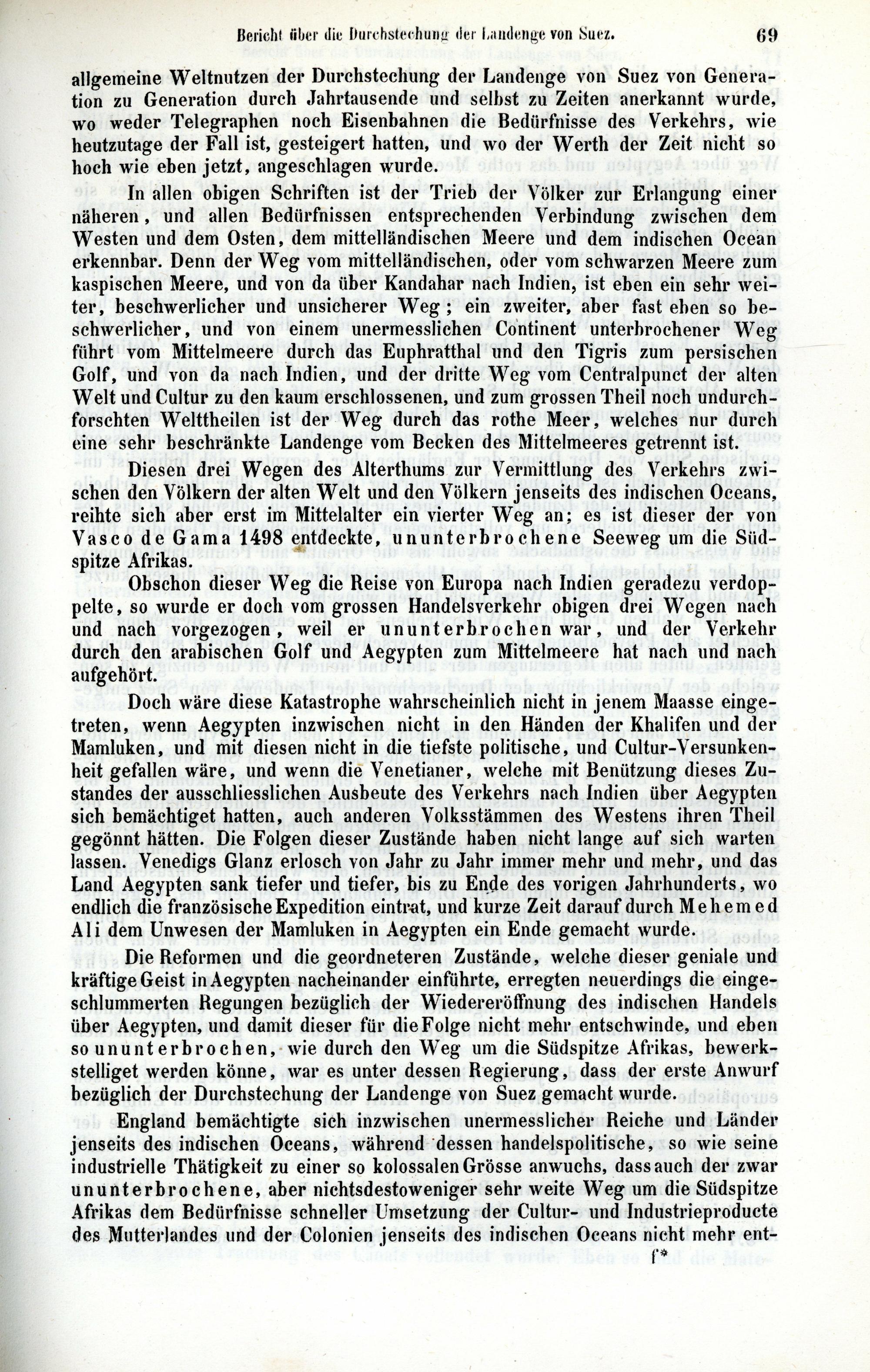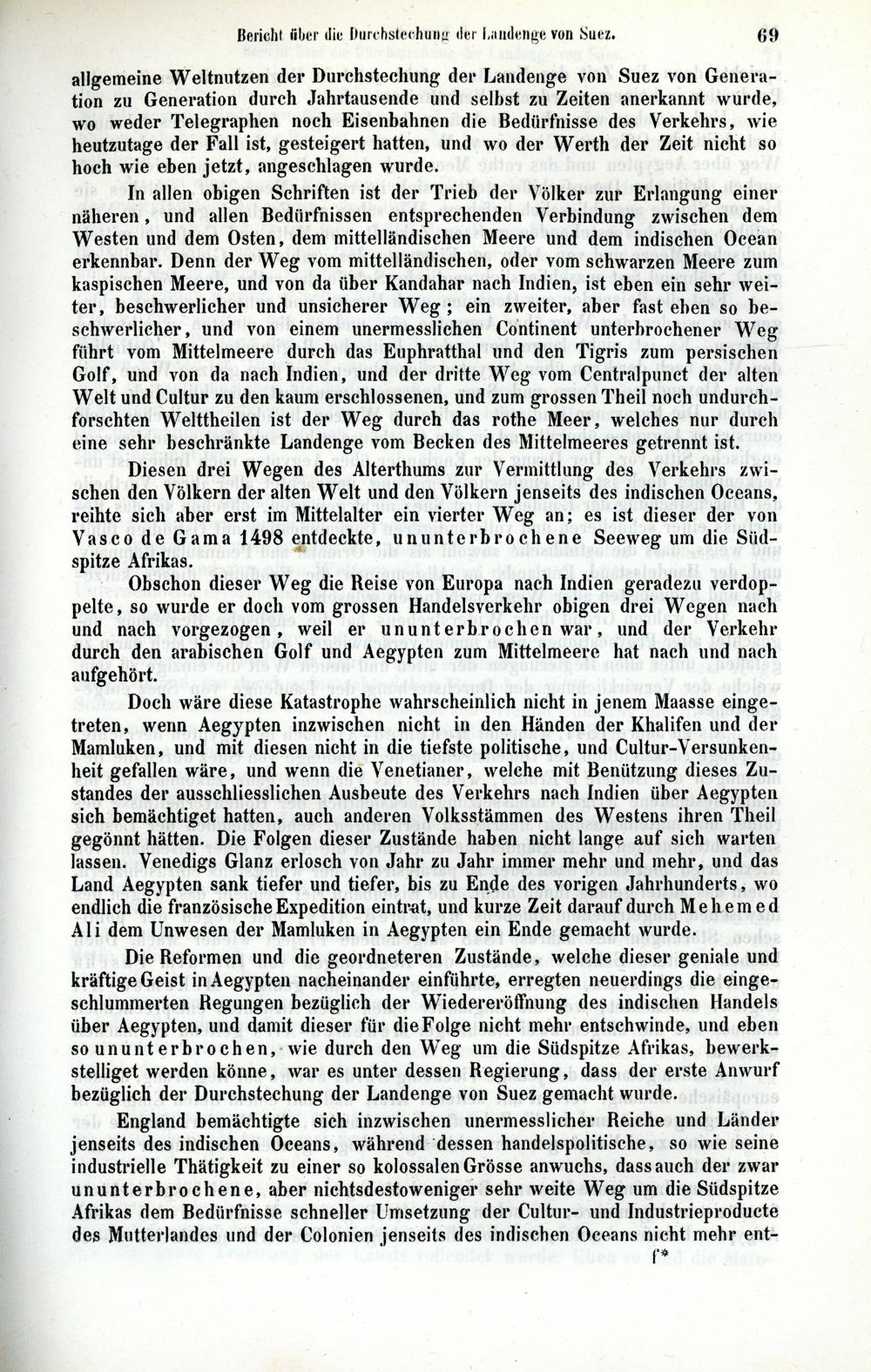 allgemeine Weltnutzen der Durchstechung der Landenge von Suez von Generation zu Generation durch Jahrtausende und selbst zu Zeiten anerkannt wurde , wo weder Telegraphen noch Eisenbahnen die Bedürfnisse des Verkehrs , wie heutzutage der Fall ist , gesteigert hatten , und wo der Werth der Zeit nicht so hoch wie eben jetzt , angeschlagen wurde . In allen obigen Schriften ist der Trieb der Völker zur Erlangung einer näheren , und allen Bedürfnissen entsprechenden Verbindung zwischen dem Westen und dem Osten , dem mittelländischen Meere und dem indischen Ocean erkennbar . Denn der Weg vom mittelländischen , oder vom schwarzen Meere zum kaspischen Meere , und von da über Kandahar nach Indien , ist eben ein sehr weiter , beschwerlicher und unsicherer Weg ; ein zweiter , aber fast eben so beschwerlicher , und von einem unermesslichen Continent unterbrochener Weg führt vom Mittelmeere durch das Euphratthal und den Tigris zum persischen Golf , und von da nach Indien , und der dritte Weg vom Centralpunct der alten Welt und Cultur zu den kaum erschlossenen , und zum grossen Theil noch undurchforschten Welttheilen ist der Weg durch das rothe Meer , welches nur durch eine sehr beschränkte Landenge vom Becken des Mittelmeeres getrennt ist . Diesen drei Wegen des Alterthums zur Vermittlung des Verkehrs zwischen den Völkern der alten Welt und den Völkern jenseits des indischen Oceans , reihte sich aber erst im Mittelalter ein vierter Weg an ; es ist dieser der von Vasco de Gama 1498 entdeckte , ununterbrochene Seeweg um die Südspitze Afrikas . Obschon dieser Weg die Reise von Europa nach Indien geradezu verdoppelte , so wurde er doch vom grossen Handelsverkehr obigen drei Wegen nach und nach vorgezogen , weil er ununterbrochen war , und der Verkehr durch den arabischen Golf und Aegypten zum Mittelmeere hat nach und nach aufgehört . Doch wäre diese Katastrophe wahrscheinlich nicht in jenem Maasse eingetreten , wenn Aegypten inzwischen nicht in den Händen der Khalifen und der Mamluken , und mit diesen nicht in die tiefste politische , und Cultur - Versunkenheit gefallen wäre , und wenn die Venetianer , welche mit Benützung dieses Zustandes der ausschliesslichen Ausbeute des Verkehrs nach Indien über Aegypten sich bemächtiget hatten , auch anderen Volksstämmen des Westens ihren Theil gegönnt hätten . Die Folgen dieser Zustände haben nicht lange auf sich warten lassen . Venedigs Glanz erlosch von Jahr zu Jahr immer mehr und mehr , und das Land Aegypten sank tiefer und tiefer , bis zu Ende des vorigen Jahrhunderts , wo endlich die französische Expedition eintrat , und kurze Zeit darauf durch Mehemed Ali dem Unwesen der Mamluken in Aegypten ein Ende gemacht wurde . Die Reformen und die geordneteren Zustände , welche dieser geniale und kräftige Geist in Aegypten nacheinander einführte , erregten neuerdings die eingeschlummerten Regungen bezüglich der Wiedereröffnung des indischen Handels über Aegypten , und damit dieser für die Folge nicht mehr entschwinde , und eben so ununterbrochen , wie durch den Weg um die Südspitze Afrikas , bewerkstelliget werden könne , war es unter dessen Regierung , dass der erste Anwurf bezüglich der Durchstechung der Landenge von Suez gemacht wurde . England bemächtigte sich inzwischen unermesslicher Reiche und Länder jenseits des indischen Oceans , während dessen handelspolitische , so wie seine industrielle Thätigkeit zu einer so kolossalen Grösse anwuchs , dass auch der zwar ununterbrochene , aber nichtsdestoweniger sehr weite Weg um die Südspitze Afrikas dem Bedürfnisse schneller Umsetzung der Cultur - und Industrieproducte des Mutterlandes und der Colonien jenseits des indischen Oceans nicht mehr ent