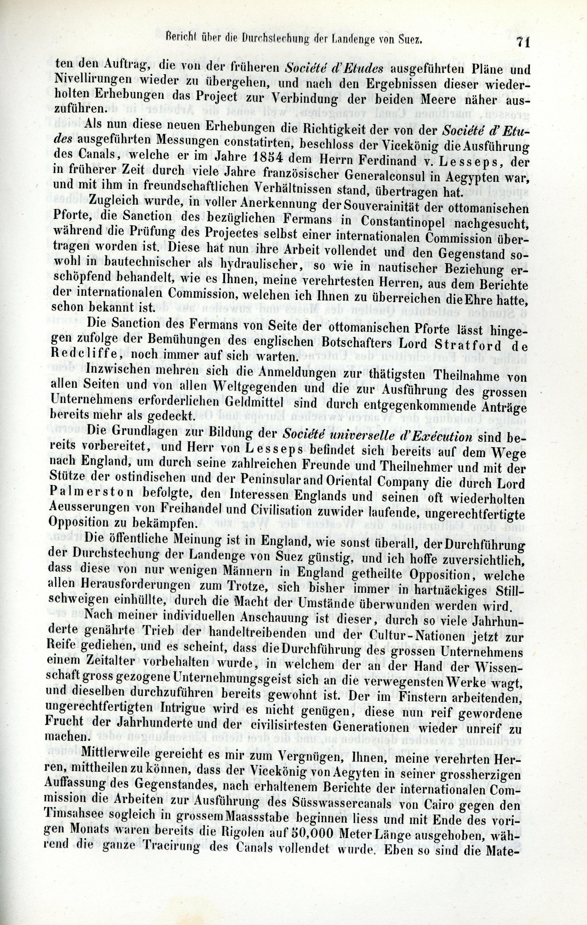 ten den Auftrag , die von der früheren Société d ’ Etudes ausgeführten Pläne und Nivellirungen wieder zu übergehen , und nach den Ergebnissen dieser wiederholten Erhebungen das Project zur Verbindung der beiden Meere näher auszuführen . Als nun diese neuen Erhebungen die Richtigkeit der von der Société d ' Etudes ausgeführten Messungen constatirten , beschloss der Vicekönig die Ausführung des Canals , welche er im Jahre 1854 dem Herrn Ferdinand v . Lesseps , der in früherer Zeit durch viele Jahre französischer Generalconsul in Aegypten war , und mit ihm in freundschaftlichen Verhältnissen stand , übertragen hat . Zugleich wurde , in voller Anerkennung der Souverainität der ottomanischen Pforte , die Sanction des bezüglichen Fermans in Constantinopel nachgesucht , während die Prüfung des Projectes selbst einer internationalen Commission übertragen worden ist . Diese hat nun ihre Arbeit vollendet und den Gegenstand sowohl in bautechnischer als hydraulischer , so wie in nautischer Beziehung erschöpfend behandelt , wie es Ihnen , meine verehrtesten Herren , aus dem Berichte der internationalen Commission , welchen ich Ihnen zu überreichen die Ehre hatte , schon bekannt ist . Die Sanction des Fermans von Seite der ottomanischen Pforte lässt hingegen zufolge der Bemühungen des englischen Botschafters Lord Stratford de Redcliffe , noch immer auf sich warten . Inzwischen mehren sich die Anmeldungen zur thätigsten Theilnahme von allen Seiten und von allen Weltgegenden und die zur Ausführung des grossen Unternehmens erforderlichen Geldmittel sind durch entgegenkommende Anträge bereits mehr als gedeckt . Die Grundlagen zur Bildung der Société universelle d ’ Exécution sind bereits vorbereitet , und Herr von Lesseps befindet sich bereits auf dem Wege nach England , um durch seine zahlreichen Freunde und Theilnehmer und mit der Stütze der ostindischen und der Peninsular and Oriental Company die durch Lord Palmerston befolgte , den Interessen Englands und seinen oft wiederholten Aeusserungen von Freihandel und Civilisation zuwider laufende , ungerechtfertigte Opposition zu bekämpfen . Die öffentliche Meinung ist in England , wie sonst überall , der Durchführung der Durchstechung der Landenge von Suez günstig , und ich hoffe zuversichtlich , dass diese von nur wenigen Männern in England getheilte Opposition , welche allen Herausforderungen zum Trotze , sich bisher immer in hartnäckiges Stillschweigen einhüllte , durch die Macht der Umstände überwunden werden wird . Nach meiner individuellen Anschauung ist dieser , durch so viele Jahrhunderte genährte Trieb der handeltreibenden und der Cultur - Nationen jetzt zur Reife gediehen , und es scheint , dass die Durchführung des grossen Unternehmens einem Zeitalter vorbehalten wurde , in welchem der an der Hand der Wissenschaft gross gezogene Unternehmungsgeist sich an die verwegensten Werke wagt , und dieselben durchzuführen bereits gewohnt ist . Der im Finstern arbeitenden , ungerechtfertigten Intrigue wird es nicht genügen , diese nun reif gewordene Frucht der Jahrhunderte und der civilisirtesten Generationen wieder unreif zu machen . Mittlerweile gereicht es mir zum Vergnügen , Ihnen , meine verehrten Herren , mittheilen zu können , dass der Vicekönig von Aegyten in seiner grossherzigen Auffassung des Gegenstandes , nach erhaltenem Berichte der internationalen Commission die Arbeiten zur Ausführung des Süsswassercanals von Cairo gegen den Timsahsee sogleich in grossem Maassstabe beginnen liess und mit Ende des vorigen Monats waren bereits die Rigolen auf 50,000 Meter Länge ausgehoben , während die ganze Tracirung des Canals vollendet wurde . Eben so sind die Mate