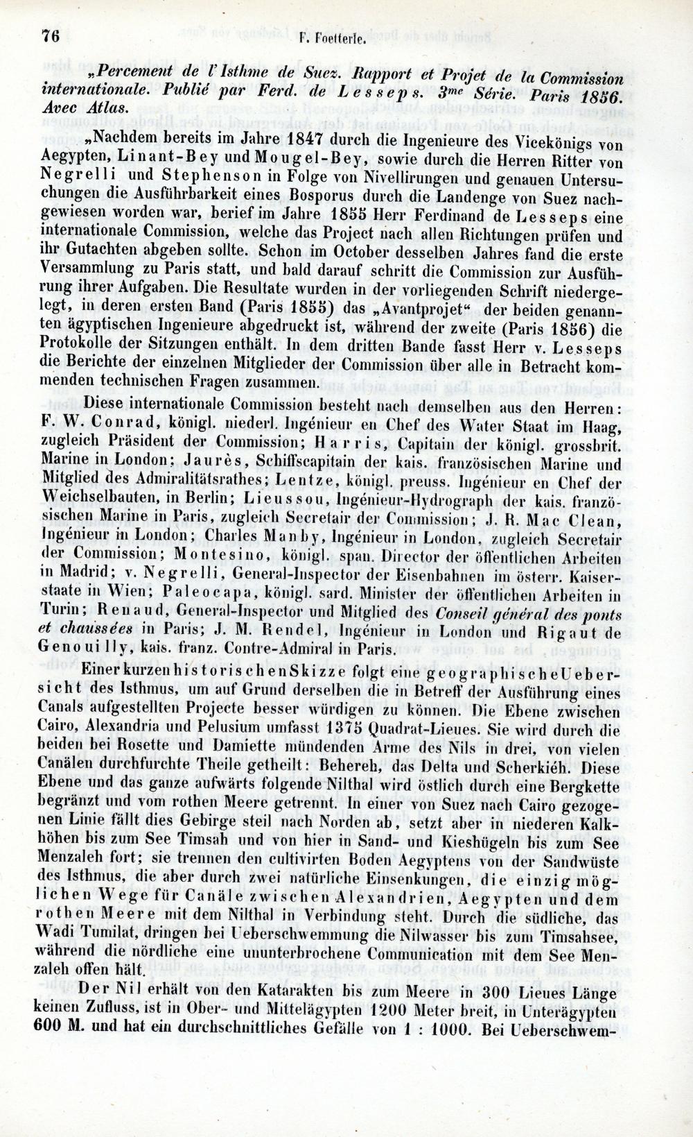 „ Percement de l ’ lsthme de Suez . Rapport et Projet de la Commission internationale . Publié par Ferd . de Les sep s . 3me Série . Paris 1856 . Avec Atlas . „ Nachdem bereits im Jahre 1847 durch die Ingenieure des Vicekönigs von Aegypten , Linant - Bey und Mougel - Bey , sowie durch die Herren Ritter von Negrelli und Stephenson in Folge von Nivellirungen und genauen Untersuchungen die Ausführbarkeit eines Bosporus durch die Landenge von Suez nachgewiesen worden war , berief im Jahre 1855 Herr Ferdinand de Les seps eine internationale Commission , welche das Project nach allen Richtungen prüfen und ihr Gutachten abgeben sollte . Schon im October desselben Jahres fand die erste Versammlung zu Paris statt , und bald darauf schritt die Commission zur Ausführung ihrer Aufgaben . Die Resultate wurden in der vorliegenden Schrift niedergelegt , in deren ersten Band ( Paris 1855 ) das „ Avantprojet “ der beiden genannten ägyptischen Ingenieure abgedruckt ist , während der zweite ( Paris 1856 ) die Protokolle der Sitzungen enthält . In dem dritten Bande fasst Herr v . Lesseps die Berichte der einzelnen Mitglieder der Commission über alle in Betracht kommenden technischen Fragen zusammen . Diese internationale Commission besteht nach demselben aus den Herren : F . W . Conrad , königl . niederl . Ingénieur en Chef des Water Staat im Haag , zugleich Präsident der Commission ; H ar ri s , Capitain der königl . grossbrit . Marine in London : Jaurès , Schiffscapitain der kais . französischen Marine und Mitglied des Admiralitätsrathes : Lentze , königl . preuss . Ingénieur en Chef der Weichselbauten , in Berlin : Lieus sou , Ingénieur - Hydrograph der kais . französischen Marine in Paris , zugleich Secretair der Commission ; J . R . Mac Clean , Ingénieur in London : Charles Manby . Ingénieur in London , zugleich Secretair der Commission ; Montesino , königl . span . Director der öffentlichen Arbeiten in Madrid : v . Negrelli , General - Inspector der Eisenbahnen im österr . Kaiserstaate in Wien : Paleocapa , königl . sard . Minister der öffentlichen Arbeiten in Turin ; Ren aud , General - Inspector und Mitglied des Conseil général des ponts et chaussées in Paris ; J . M . Rendel , Ingénieur in London und Rigaut de Genoui lly , kais . franz . Contre - Admiral in Paris . Einer kurzen historis chen Skizze folgt eine geographische Uebersicht des Isthmus , um auf Grund derselben die in Betreff der Ausführung eines Canals aufgestellten Projecte besser würdigen zu können . Die Ebene zwischen Cairo , Alexandria und Pelusium umfasst 1375 Quadrat - Lieues . Sie wird durch die beiden bei Rosette und Damiette mündenden Arme des Nils in drei , von vielen Canälen durchfurchte Theile getheilt : Behereh , das Delta und Scherkiéh . Diese Ebene und das ganze aufwärts folgende Nilthal wird östlich durch eine Bergkette begränzt und vom rothen Meere getrennt . In einer von Suez nach Cairo gezogenen Linie fällt dies Gebirge steil nach Norden ab , setzt aber in niederen Kalkhöhen bis zum See Timsah und von hier in Sand - und Kieshügeln bis zum See Menzaleh fort ; sie trennen den cultivirten Boden Aegyptens von der Sandwüste des Isthmus , die aber durch zwei natürliche Einsenkungen , die einzig möglichen Wege für Canäle zwischen Alexandrien , Aegypten und dem rothen Meere mit dem Nilthal in Verbindung steht . Durch die südliche , das Wadi Tumilat , dringen bei Ueberschwemmung die Nilwasser bis zum Timsahsee , während die nördliche eine ununterbrochene Communication mit dem See Menzaleh offen hält . Der Nil erhält von den Katarakten bis zum Meere in 300 Lieues Länge keinen Zufluss , ist in Ober - und Mittelägypten 1200 Meter breit , in Unterägypten 600 M . und hat ein durchschnittliches Gefälle von 1 : 1000 . Bei Ueberschwem