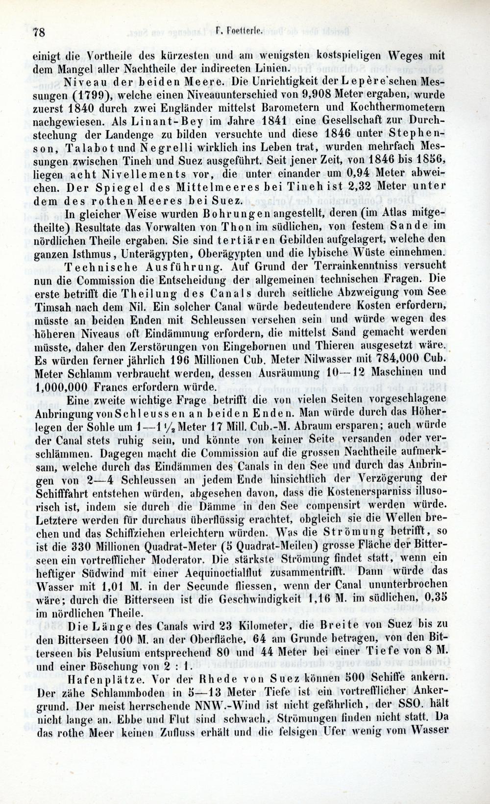 einigt die Vortheile des kürzesten und am wenigsten kostspieligen Weges mit dem Mangel aller Nachtheile der indirecten Linien . Niveau der beiden Meere . Die Unrichtigkeit der Lepère ' schen Messungen ( 1799 ) , welche einen Niveauunterschied von 9,908 Meter ergaben , wurde zuerst 1840 durch zwei Engländer mittelst Barometern und Kochthermometern nachgewiesen . Als Linant - Bey im Jahre 1841 eine Gesellschaft zur Durchstechung der Landenge zu bilden versuchte und diese 1846 unter Stephenson , T alabot und Ne grelli wirklich ins Leben trat , wurden mehrfach Messungen zwischen Tineh und Suez ausgeführt . Seit jener Zeit , von 1846 bis 1856 , liegen acht Nivellements vor , die unter einander um 0,94 Meter abweichen . Der Spiegel des Mittelmeeres bei Tineh ist 2,32 Meter unter dem des rothen Meeres bei Suez . In gleicher Weise wurden Bohrungen angestellt , deren ( im Atlas mitgetheilte ) Resultate das Vorwalten von Thon im südlichen , von festem Sande im nördlichen Theile ergaben . Sie sind tertiären Gebilden aufgelagert , welche den ganzen Isthmus , Unterägypten , Oberägypten und die lybische Wüste einnehmen . Technische Ausführung . Auf Grund der Terrainkenntniss versucht nun die Commission die Entscheidung der allgemeinen technischen Fragen . Die erste betrifft die Theilung des Canals durch seitliche Abzweigung vom See Timsah nach dem Nil . Ein solcher Canal würde bedeutendere Kosten erfordern , müsste an beiden Enden mit Schleussen versehen sein und würde wegen des höheren Niveaus oft Eindämmung erfordern , die mittelst Sand gemacht werden müsste , daher den Zerstörungen von Eingebornen und Thieren ausgesetzt wäre . Es würden ferner jährlich 196 Millionen Cub . Meter Nilwasser mit 784,000 Cub . Meter Schlamm verbraucht werden , dessen Ausräumung 10 — 12 Maschinen und 1,000,000 Francs erfordern würde . Eine zweite wichtige Frage betrifft die von vielen Seiten vorgeschlagene Anbringung von Schleussen an beiden Enden . Man würde durch das Höherlegen der Sohle um 1 — 1½ , Meter 17 Mill . Cub . - M . Abraum ersparen ; auch würde der Canal stets ruhig sein , und könnte von keiner Seite versanden oder verschlämmen . Dagegen macht die Commission auf die grossen Nachtheile aufmerksam , welche durch das Eindämmen des Canals in den See und durch das Anbringen von 2 — 4 Schleussen an jedem Ende hinsichtlich der Verzögerung der Schifffahrt entstehen würden , abgesehen davon , dass die Kostenersparniss illusorisch ist , indem sie durch die Dämme in den See compensirt werden würde . Letztere werden für durchaus überflüssig erachtet , obgleich sie die Wellen brechen und das Schiffziehen erleichtern würden . Was die Strömung betrifft , so ist die 330 Millionen Quadrat - Meter ( 5 Quadrat - Meilen ) grosse Fläche der Bitterseen ein vortrefflicher Moderator . Die stärkste Strömung findet statt , wenn ein heftiger Südwind mit einer Aequinoctialflut zusammentrifft . Dann würde das Wasser mit 1,01 M . in der Secunde fliessen , wenn der Canal ununterbrochen wäre ; durch die Bitterseen ist die Geschwindigkeit 1,16 M . im südlichen , 0 , 35 im nördlichen Theile . Die Länge des Canals wird 23 Kilometer , die Breite von Suez bis zu den Bitterseen 100 M . an der Oberfläche , 64 am Grunde betragen , von den Bitterseen bis Pelusium entsprechend 80 und 44 Meter bei einer Tiefe von 8 M . und einer Böschung von 2 : 1 . Hafenplätze . Vor der Rhede von Suez können 500 Schiffe ankern . Der zähe Schlammboden in 5 — 13 Meter Tiefe ist ein vortrefflicher Ankergrund . Der meist herrschende NNW . - Wind ist nicht gefährlich , der SSO . hält nicht lange an . Ebbe und Flut sind schwach , Strömungen finden nicht statt . Da das rothe Meer keinen Zufluss erhält und die felsigen Ufer wenig vom Wasser