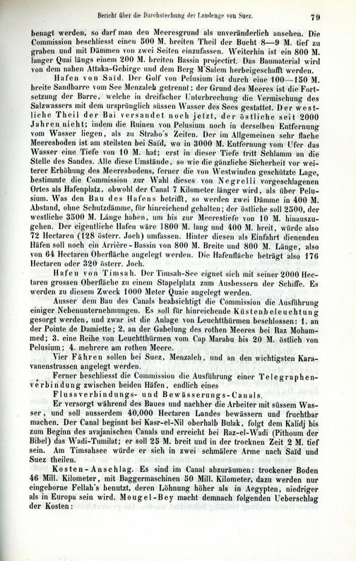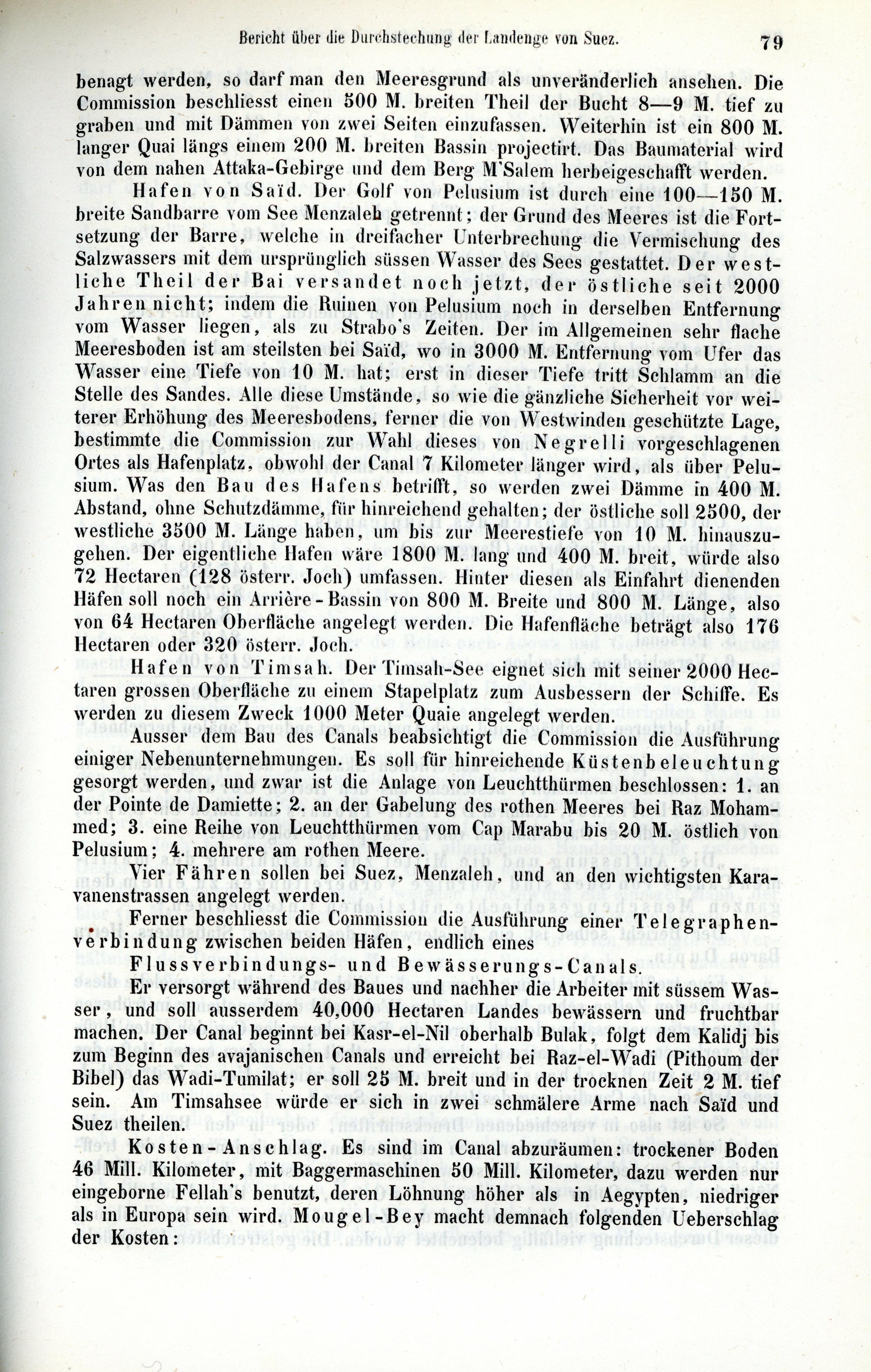 benagt werden , so darf man den Meeresgrund als unveränderlich ansehen . Die Commission beschliesst einen 500 M . breiten Theil der Bucht 8 — 9 M . tief zu graben und mit Dämmen von zwei Seiten einzufassen . Weiterhin ist ein 800 M . langer Quai längs einem 200 M . breiten Bassin projectirt . Das Baumaterial wird von dem nahen Attaka - Gebirge und dem Berg M'Salem herbeigeschafft werden . Hafen von Said . Der Golf von Pelusium ist durch eine 100 — 150 M . breite Sandharre vom See Menzaleh getrennt ; der Grund des Meeres ist die Fortsetzung der Barre , welche in dreifacher Unterbrechung die Vermischung des Salzwassers mit dem ursprünglich süssen Wasser des Sees gestattet . Der westliche Theil der Bai versandet noch jetzt , der östliche seit 2000 Jahren nicht ; indem die Ruinen von Pelusium noch in derselben Entfernung vom Wasser liegen , als zu Strabo 's Zeiten . Der im Allgemeinen sehr flache Meeresboden ist am steilsten bei Said , wo in 3000 M . Entfernung vom Ufer das Wasser eine Tiefe von 10 M . hat ; erst in dieser Tiefe tritt Schlamm an die Stelle des Sandes . Alle diese Umstände , so wie die gänzliche Sicherheit vor weiterer Erhöhung des Meeresbodens , ferner die von Westwinden geschützte Lage , bestimmte die Commission zur Wahl dieses von Negrelli vorgeschlagenen Ortes als Hafenplatz , obwohl der Canal 7 Kilometer länger wird , als über Pelusium . Was den Bau des Hafens betrifft , so werden zwei Dämme in 400 M . Abstand , ohne Schutzdämme , für hinreichend gehalten ; der östliche soll 2500 , der westliche 3500 M . Länge haben , um bis zur Meerestiefe von 10 M . hinauszugehen . Der eigentliche Hafen wäre 1800 M . lang und 400 M . breit , würde also 72 Hectaren ( 128 österr . Joch ) umfassen . Hinter diesen als Einfahrt dienenden Häfen soll noch ein Arrière - Bassin von 800 M . Breite und 800 M . Länge , also von 64 Hectaren Oberfläche angelegt werden . Die Hafenfläche beträgt also 176 Hectaren oder 320 österr . Joch . Hafen von Timsah . Der Timsah - See eignet sich mit seiner 2000 Hectaren grossen Oberfläche zu einem Stapelplatz zum Ausbessern der Schiffe . Es werden zu diesem Zweck 1000 Meter Quaie angelegt werden . Ausser dem Bau des Canals beabsichtigt die Commission die Ausführung einiger Nebenunternehmungen . Es soll für hinreichende Küstenbeleuchtung gesorgt werden , und zwar ist die Anlage von Leuchtthürmen beschlossen : 1 . an der Pointe de Damiette : 2 . an der Gabelung des rothen Meeres bei Raz Mohammed ; 3 . eine Reihe von Leuchtthürmen vom Cap Marabu bis 20 M . östlich von Pelusium : 4 . mehrere am rothen Meere . Vier Fähren sollen bei Suez , Menzaleh , und an den wichtigsten Karavanenstrassen angelegt werden . Ferner beschliesst die Commission die Ausführung einer Telegraphen - verbindung zwischen beiden Häfen , endlich eines Flussverbindungs - und Bewässerungs - Canals . Er versorgt während des Baues und nachher die Arbeiter mit süssem Wasser , und soll ausserdem 40 . 000 Hectaren Landes bewässern und fruchtbar machen . Der Canal beginnt bei Kasr - el - Nil oberhalb Bulak , folgt dem Kalidj bis zum Beginn des avajanischen Canals und erreicht bei Raz - el - Wadi ( Pithoum der Bibel ) das Wadi - Tumilat ; er soll 25 M . breit und in der trocknen Zeit 2 M . tief sein . Am Timsahsee würde er sich in zwei schmälere Arme nach Said und Suez theilen . Kosten - Anschlag . Es sind im Canal abzuräumen : trockener Boden 46 Mill . Kilometer , mit Baggermaschinen 50 Mill . Kilometer , dazu werden nur eingeborne Fellah ' s benutzt , deren Löhnung höher als in Aegypten , niedriger als in Europa sein wird . Mougel - Bey macht demnach folgenden Ueberschlag der Kosten :