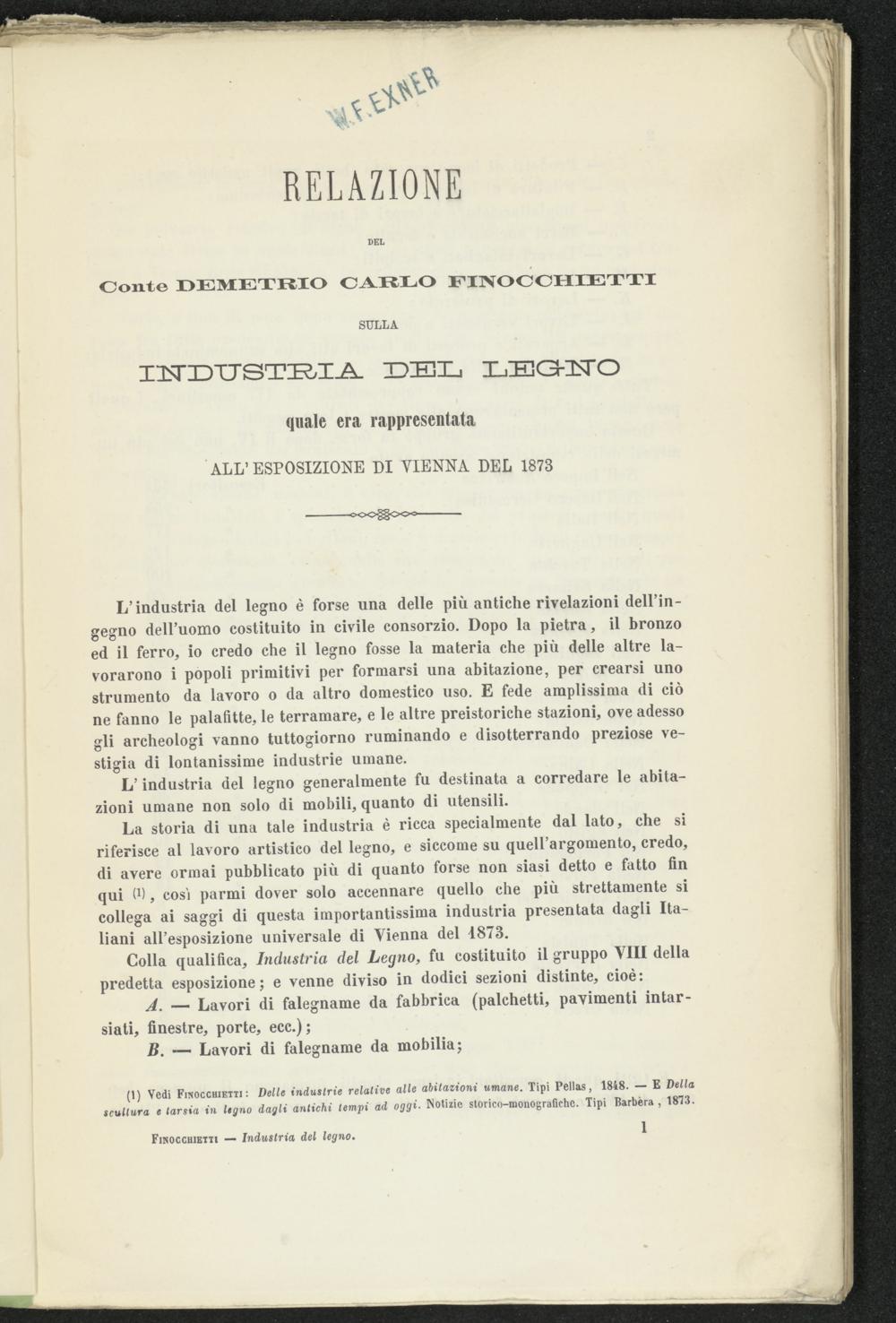 BIBL-WA122: Relazione del conte Demetrio Carlo Finocchietti sulla industria del legno quale era rappresentata all'esposizione universale di Vienna nel giugno 1873