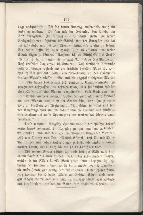 Lage nachzudenken. Ich sah keinen Ausweg, unserer Geldnot!) ein Ende zu machen. Da kam mir der Gedanke, den Pascha um Geld anzugehen. Ich entwarf eine Bittschrift, stellte ihm meine Verlegenheit vor, schilderte die Schlechtigkeit der Europäer und bat ihn schließlich, mir auf vier Monate fünftausend Piaster zu leihen. Bis dahin hoffte ich vom Hause Geld zu erhalten und meine Schuld tilgen zu können. Nachdem ich die Bittschrift in's Arabische übersetzt hatte, sandte ich sie durch Aali-Arha dem Pascha zu. Noch denselben Tag erhielt ich Antwort. Nach türkischem Gebrauche hatte der Pascha sogleich auf der Rückseite desselben Papieres, welches ich ihm zugesandt hatte, eine Verordnung an den Schatzmeister der Mudinc erlassen. Sie enthielt ungefähr folgende Worte:
