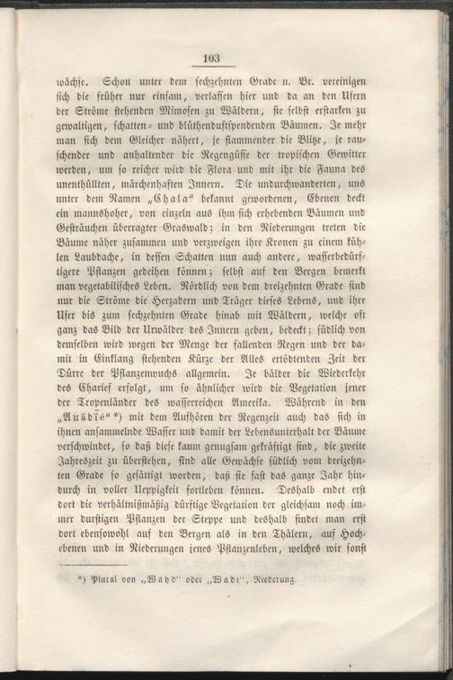 wächst. Schon unter dem sechzehnten Grade n. Br. vereinigen sich die früher nur einsam, verlassen hier und da an den Ufern der Ströme stehenden Mimosen zu Wäldern, sie selbst erstarken zu gewaltigen, schatten- und blüthcnduftspendenden Bäumen. Je mehr man sich dem Gleicher nähert, je flammender die Blitze, je rauschender und anhaltender die Regengüsse der tropischen Gewitter werden, um so reicher wird die Flora und mit ihr die Fauna des »«enthüllten, märchenhaften Innern. Die undurchwandcrtcn, uns unter dem Namen „Chala" bekannt gewordenen, Ebenen deckt ein mannshoher, von einzeln aus ihm sich erhebenden Bäumen und Gesträuchen überragter Graswald; in den Niederungen treten die Bäume näher zusammen und verzweigen ihre Kronen zu einem kühlen Laubdache, in dessen Schatten nun auch andere, wasserbcdürf- tigere Pflanzen gedeihen können; selbst auf den Bergen bemerkt man vegetabilisches Leben. Nördlich von dem dreizehnten Grade sind nur die Ströme die Hcrzadern und Träger dieses Lebens, und ihre Ufer bis zum sechzehnten Grade hinab mit Wäldern, welche oft ganz das Bild der Urwälder des Innern geben, bedeckt; südlich von demselben wird wegen der Menge der fallenden Regen und der damit in Einklang stehenden Kürze der Alles crtödtcnden Zeit der Dürre der Pflanzenwuchs allgemein. Je bälder die Wiederkehr des Charicf erfolgt, um so ähnlicher wird die Vegetation jener der Tropenländcr des wasserreichen Amerika. Während in den „AuLd'iö"'*) mit dem Aufhören der Regenzeit auch das sich in ihnen ansammelnde Wasser und damit der Lebensunterhalt der Bäume verschwindet, so daß diese kaum genugsam gekräftigt sind, die zweite Jahreszeit zu überstehen, sind alle Gewächse südlich vom dreizehnten Grade so gesättigt worden, daß sie fast das ganze Jahr hindurch in voller Ueppigkeit fortleben können. Deshalb endet erst dort die verhältnißmäßig dürftige Vegetation der gleichsam noch immer durstigen Pflanzen der Steppe und deshalb findet man erst dort ebensowohl auf den Bergen als in den Thälern, auf Hochebenen und in Niederungen jenes Pflanzenlcben, welches wir sonst
