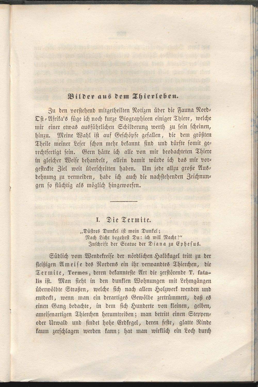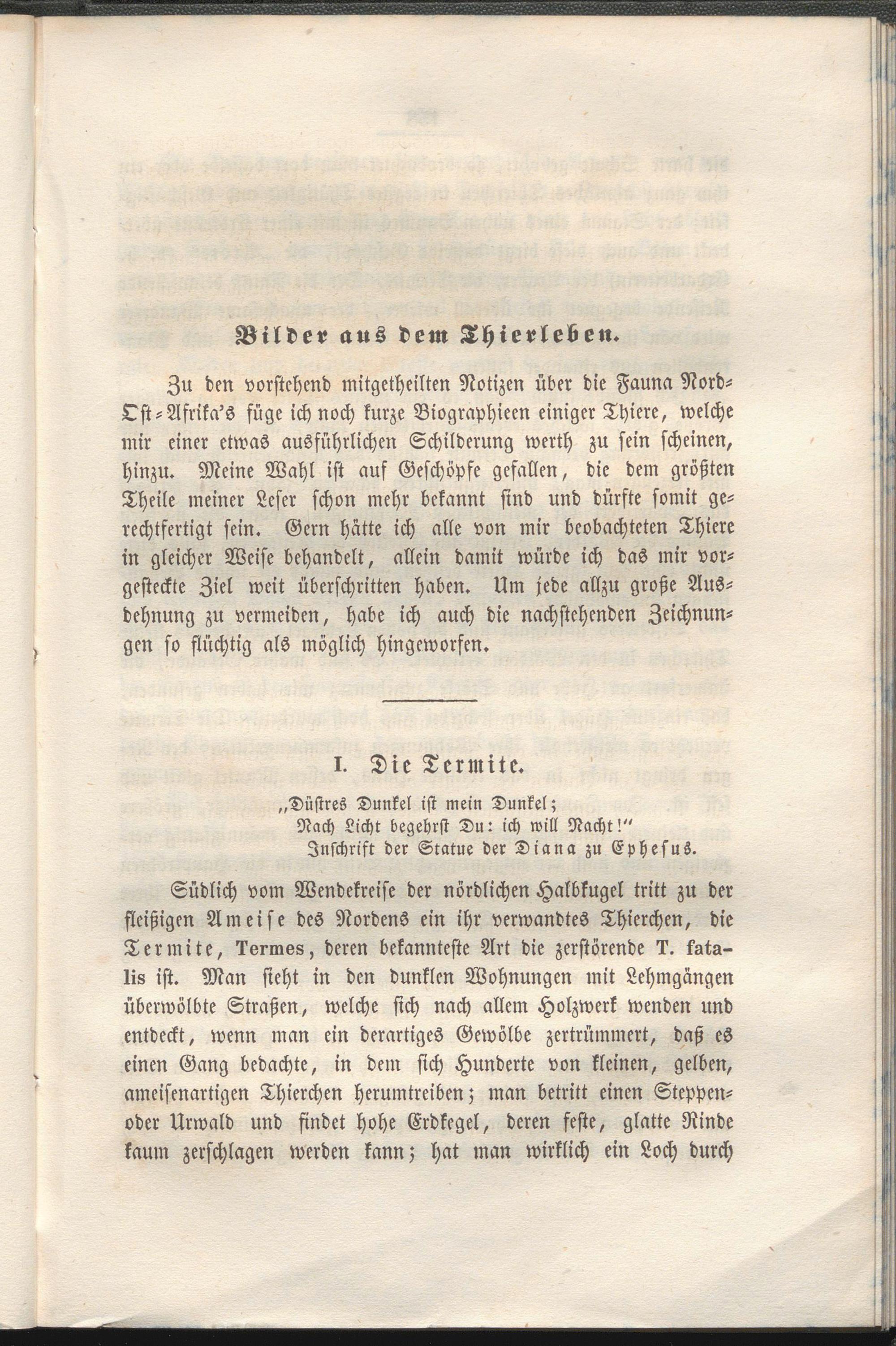 Zu den vorstehend mitgetheilten Notizen über die Fauna Nord- Ost-Afrika's füge ich noch kurze Biographicen einiger Thiere, welche mir einer etwas ausführlichen Schilderung werth zu sein scheinen, hinzu. Meine Wahl ist auf Geschöpfe gefallen, die dem größten Theile meiner Leser schon mehr bekannt sind und dürfte somit gerechtfertigt sein. Gern hätte ich alle von mir beobachteten Thiere in gleicher Weise behandelt, allein damit würde ich das mir vorgesteckte Ziel weit überschritten haben. Um jede allzu große Ausdehnung zu vermeiden, habe ich auch die nachstehenden Zeichnungen so flüchtig als möglich hingeworfen.