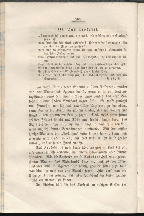 Es macht einen eigenen Eindruck auf den Reisenden, welcher das alte Wunderland Egyptcn bereist, wenn er in den Nachmit- tagsstunden eines der sonnigen Tage jenes Landes das erste Krokodil auf einer flachen Sandbank liegen sieht. Er greift zunächst zum Fernrohr, um sich das urwcltliche Ungeheuer zu betrachten, ? dann aber in der Absicht zur sicheren Büchse, ihm wo möglich eine Kugel in den gepanzerten Leib zu jagen. Doch dieses kennt seines größten Feindes Macht und Tücke und kriecht, lange bevor das Schiff des Reisenden in Schußnähe gelangt, gemächlich in den Nil, somit zugleich fernere Beobachtungen vereitelnd. Will der wißbegierige Wanderer den „Lcviathan" besser kennen lernen, dann muß er weiter nach Süden ziehen, erst dort trifft er ihn in so großer Anzahl, daß er seinen Zweck erreicht.