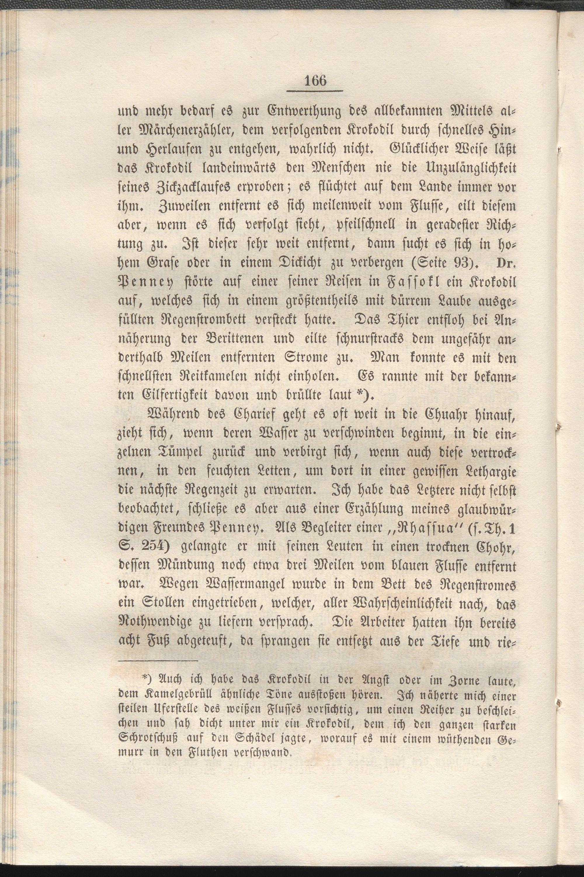 *) Auch ich habe das Krokodil in der Angst oder im Zorne laute, dem Kamelgebrüll ähnliche Töne ausstoßen hören. Ich näherte mich einer steilen Uferstelle des weißen Flusses vorsichtig, um einen Reiher zu beschlei- chen und sah dicht unter mir ein Krokodil, dein ich den ganzen starken Schrotschuß auf den Schädel jagte, worauf es mit einem wüthenden Ge- murr in den Fluthen verschwand.