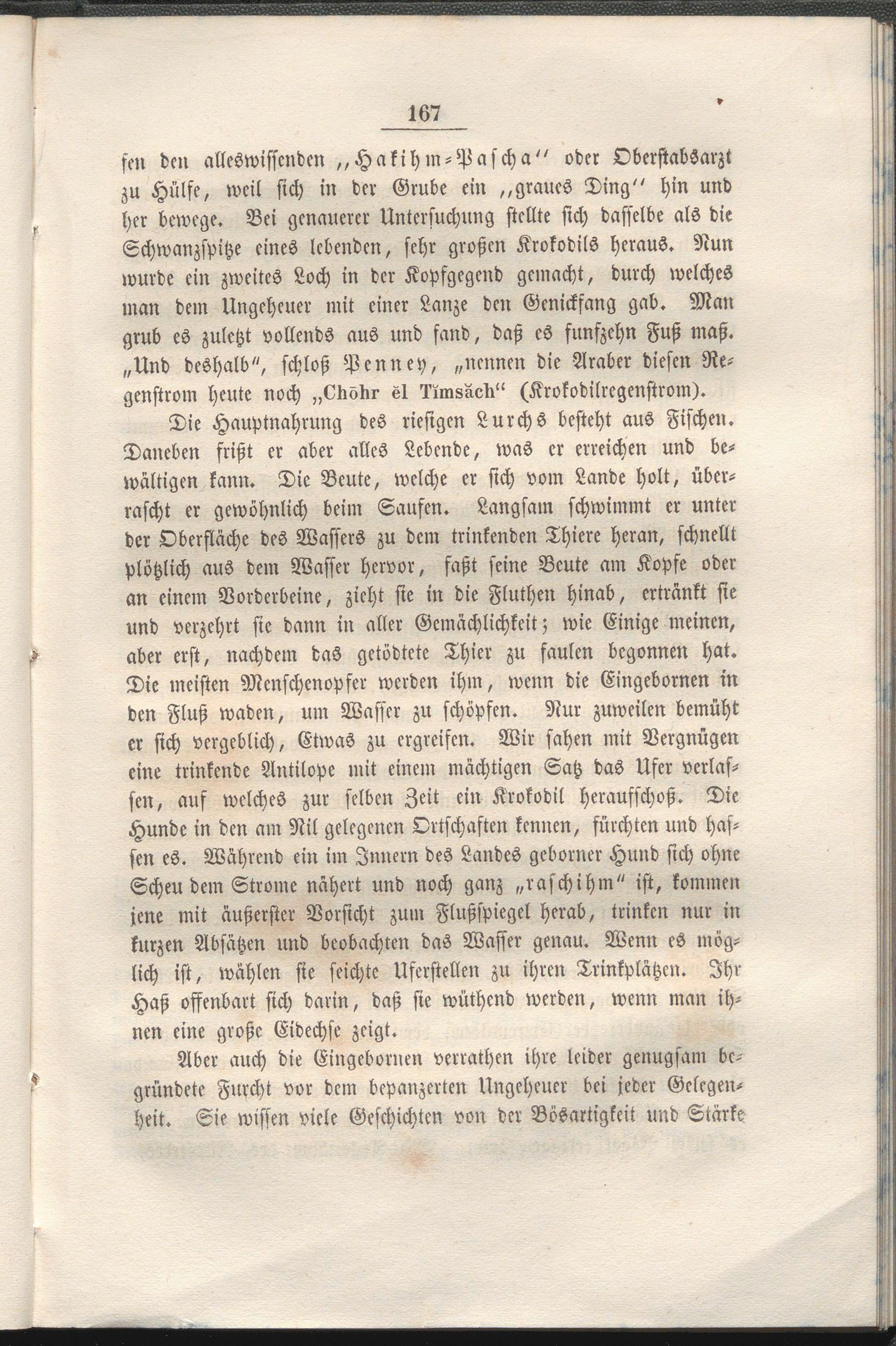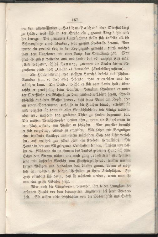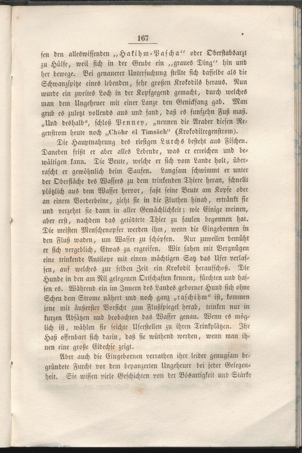 Die meisten Menschenopfer werden ihm, wenn die Eingebornen in den Fluß wadcn, um Wasser zu schöpfen. Nur zuweilen bemüht er sich vergeblich, Etwas zu ergreifen. Wir sahen mit Vergnügen eine trinkende Antilope mit einem mächtigen Satz das Ufer verlassen, auf welches zur selben Zeit ein Krokodil herausschoß. Die Hunde in den am Nil gelegenen Ortschaften kennen, fürchten und hassen es. Während ein im Innern des Landes geborner Hund sich ohne Scheu dem Strome nähert und noch ganz „raschihm" ist, kommen jene mit äußerster Vorsicht zum Flußspiegel herab, trinken nur in kurzen Absätzen und beobachten das Wasser genau. Wenn es möglich ist, wählen sie seichte Uferstellen zu ihren Trinkplätzcn. Ihr Haß offenbart sich darin, daß sie wüthend werden, wenn man ihnen eine große Eidechse zeigt.