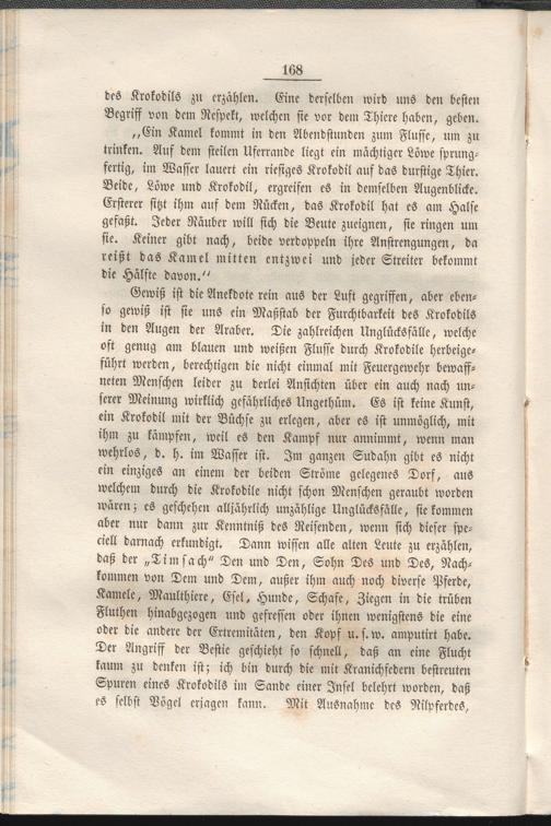 Gewiß ist die Anekdote rein aus der Luft gegriffen, aber ebenso gewiß ist sie uns ein Maßstab der Furchtbarkeit des Krokodils in den Augen der Araber. Die zahlreichen Unglücksfälle, welche oft genug am blauen und weißen Flusse durch Krokodile herbeigeführt werden, berechtigen die nicht einmal mit Feuergewchr bewaffneten Menschen leider zu derlei Ansichten über ein auch nach unserer Meinung wirklich gefährliches Ungethüm. Es ist keine Kunst, ein Krokodil mit der Büchse zu erlegen, aber es ist unmöglich, mit ihm zu kämpfen, weil es den Kampf nur annimmt, wenn man wehrlos, d. h. im Wasser ist. Im ganzen Sudahn gibt es nicht ein einziges an einem der beiden Ströme gelegenes Dorf, aus welchem durch die Krokodile nicht schon Menschen geraubt worden wären, es geschehen alljährlich unzählige Unglücksfälle, sie kommen aber nur dann zur Kenntniß des Reisenden, wenn sich dieser speciell darnach erkundigt. Dann wissen alle alten Leute zu erzählen, daß der „Timfach" Den und Den, Sohn Des und Des, Nachkommen von Dem und Dem, außer ihm auch noch diverse Pferde, Kamele, Maulthiere, Esel, Hunde, Schafe, Ziegen in die trüben Fluthen hinabgczogen und gefressen oder ihnen wenigstens die eine oder die andere der Extremitäten, den Kopf u.s.w. amputirt habe. Der Angriff der Bestie geschieht so schnell, daß an eine Flucht kaum zu denken ist; ich bin durch die mit Kranichfcdcrn bestreuten Spuren eines Krokodils im Sande einer Insel belehrt worden, daß es selbst Böget erjagen kann. Mit Ausnahme des Nilpferdes,