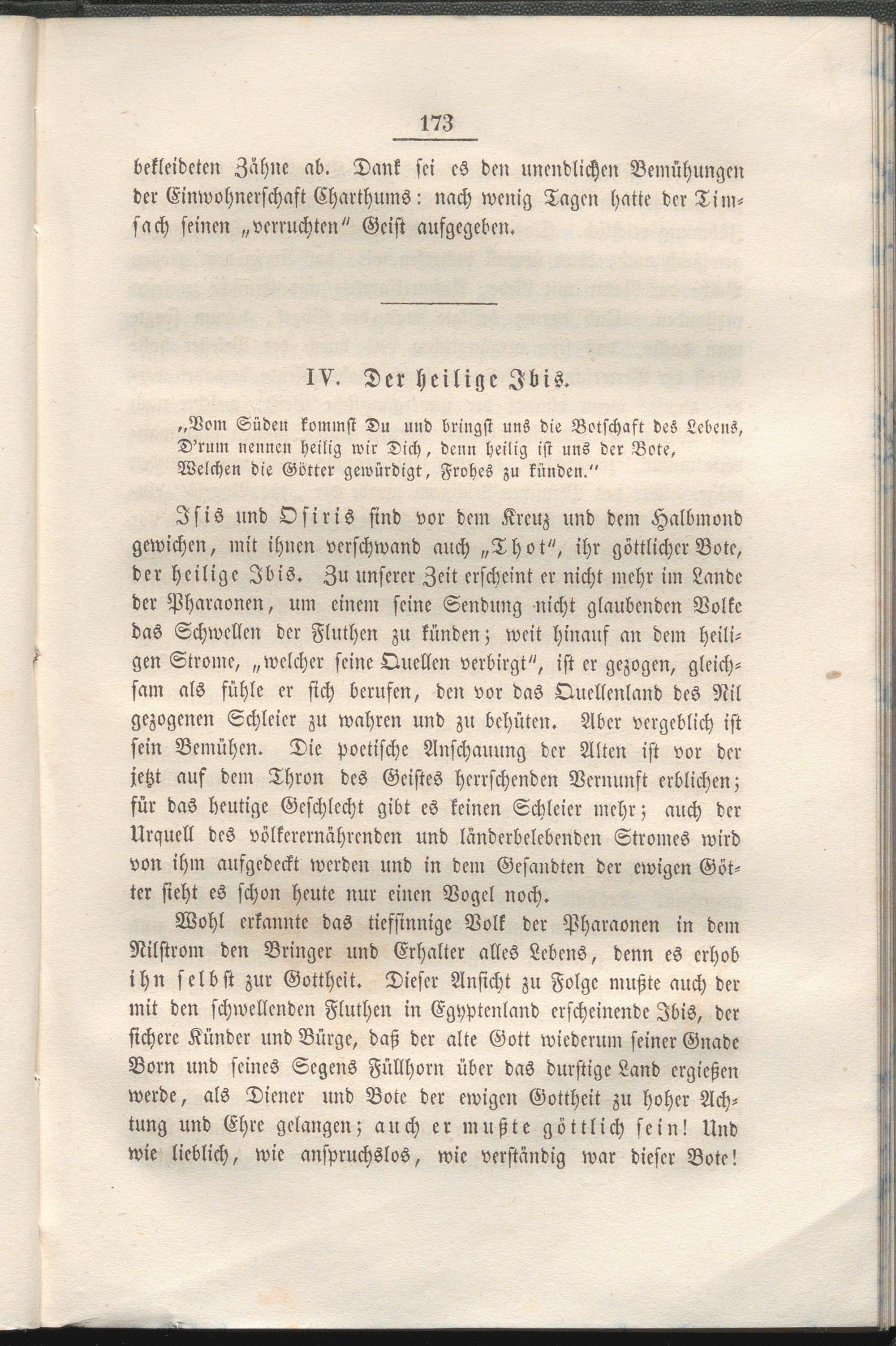 Isis und Osiris sind vor dem Kreuz und dem Halbmond gewichen, mit ihnen verschwand auch „T h o t", ihr göttlicher Bote, der heilige Ibis. Zu unserer Zeit erscheint er nicht mehr im Lande der Pharaonen, um einem seine Sendung nicht glaubenden Volke das Schwellen der Fluchen zu künden; weit hinauf an dem heiligen Strome, „welcher seine Quellen verbirgt", ist er gezogen, gleichsam als fühle er sich berufen, den vor das Quellenland des Nil gezogenen Schleier zu wahren und zu behüten. Aber vergeblich ist sein Bemühen. Die poetische Anschauung der Alten ist vor der jetzt auf dem Thron des Geistes herrschenden Vernunft erblichen; für das heutige Geschlecht gibt es keinen Schleier mehr; auch der Urquell des völkcrcrnährcndcn und länderbelebenden Stromes wird von ihm aufgedeckt werden und in dem Gesandten der ewigen Götter sieht es schon heute nur einen Vogel noch.
