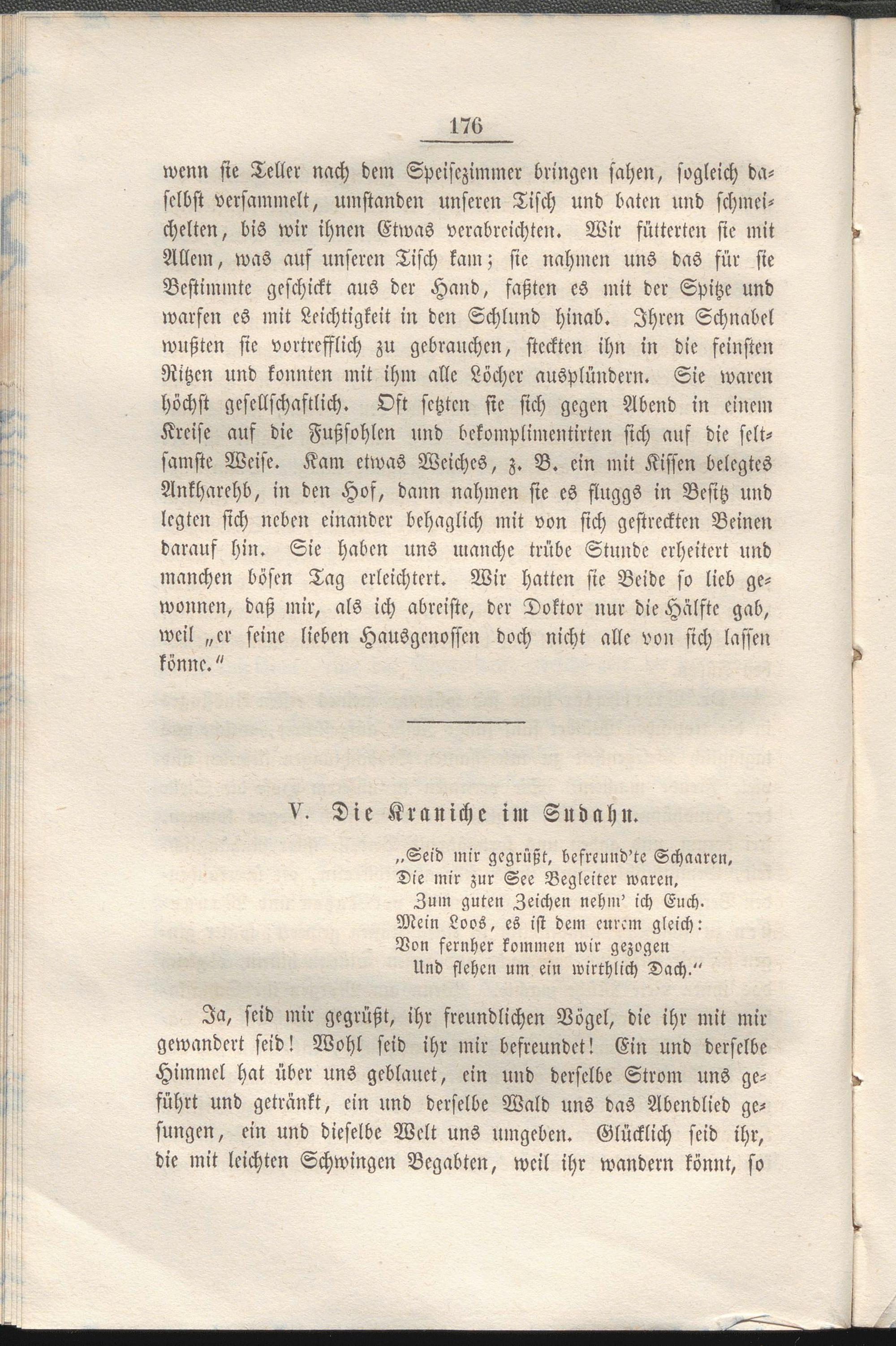 Ja, seid mir gegrüßt, ihr freundlichen Vögcl, die ihr mit mir gewandert seid! Wohl seid ihr mir befreundet! Ein und derselbe Himmel hat über uns geblauet, ein und derselbe Strom uns geführt und getränkt, ein und derselbe Wald uns das Abendlied gesungen, ein und dieselbe Welt uns umgeben. Glücklich seid ihr, die mit leichten Schwingen Begabten, weil ihr wandern könnt, so