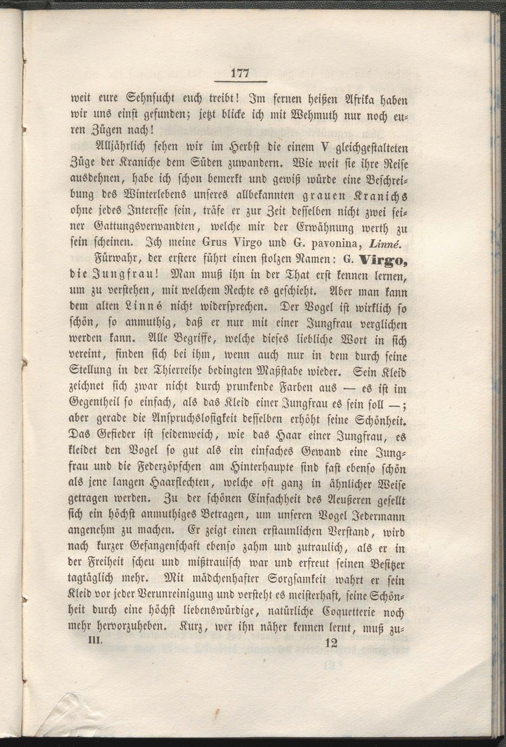 Fürwahr, der erstere führt einen stolzen Namen: 6. VirK», die Jungfrau! Man muß ihn in der That erst kennen lernen, um zu verstehen, mit welchem Rechte es geschieht. Aber man kann dem alten Linus nicht widersprechen. Der Vogel ist wirklich so schön, so anmuthig, daß er nur mit einer Jungfrau verglichen werden kann. Alle Begriffe, welche dieses liebliche Wort in sich vereint, finden sich bei ihm, wenn auch nur in dem durch seine Stellung in der Thierreihe bedingten Maßstabe wieder. Sein Kleid zeichnet sich zwar nicht durch prunkende Farben aus — es ist im Gegentheil so einfach, als das Kleid einer Jungfrau es sein soll —; aber gerade die Anspruchslosigkeit desselben erhöht seine Schönheit. Das Gefieder ist seidenweich, wie das Haar einer Jungfrau, es kleidet den Vogel so gut als ein einfaches Gewand eine Jungfrau und die Federzöpfchcn am Hinterhaupte sind fast ebenso schön als jene langen Haarflechten, welche oft ganz in ähnlicher Weise getragen werden. Zu der schönen Einfachheit des Aeußeren gesellt sich ein höchst anmuthiges Betragen, um unseren Vogel Jedermann angenehm zu machen. Er zeigt einen erstaunlichen Verstand, wird nach kurzer Gefangenschaft ebenso zahm und zutraulich, als er in der Freiheit scheu und mißtrauisch war und erfreut seinen Besitzer tagtäglich mehr. Mit mädchenhafter Sorgsamkeit wahrt er sein Kleid vor jeder Verunreinigung und versteht es meisterhaft, seine Schönheit durch eine höchst liebenswürdige, natürliche Coquettcrie noch mehr hervorzuheben. Kurz, wer ihn näher kennen lernt, muß zürn 12