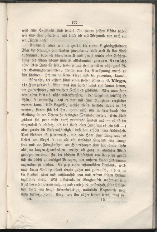 Alljährlich sehen wir im Herbst die einem V gleichgestalteten Züge der Kraniche dem Süden zuwandern. Wie weit sie ihre Reise ausdehnen, habe ich schon bemerkt und gewiß würde eine Beschreibung des Winterlcbens unseres allbekannten grauen Kranichs ohne jedes Interesse sein, träfe er zur Zeit desselben nicht zwei seiner Gattungsverwandten, welche mir der Erwähnung werth zu sein scheinen. Ich meine 6rv8 VirZo und 6. pavonina, Lrnne.