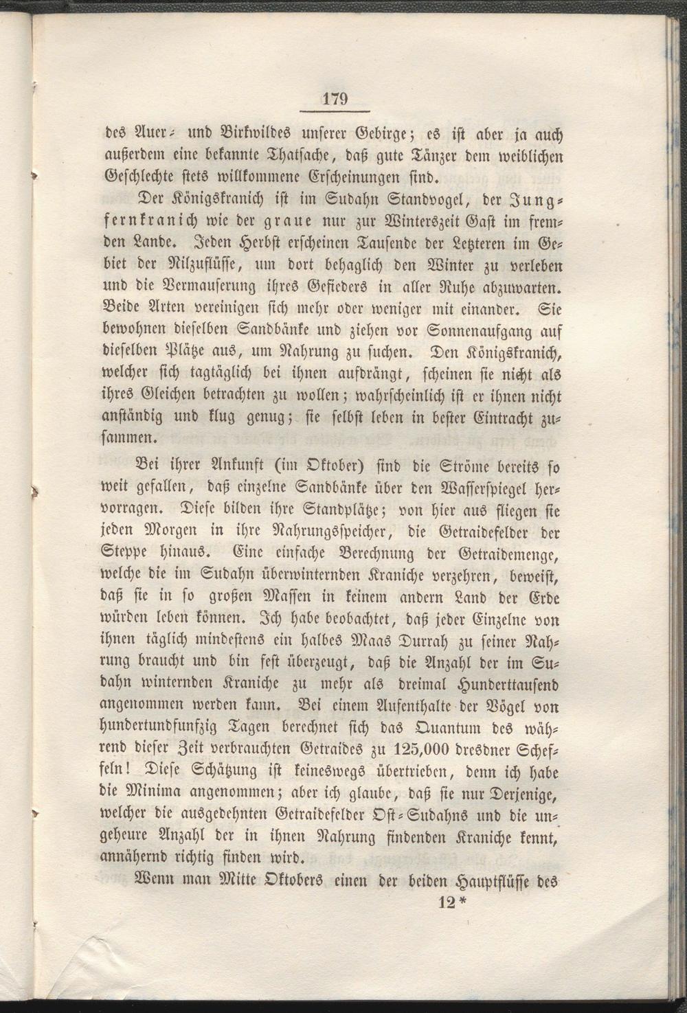 vorragen. Diese bilden ihre Standplätze; von hier aus fliegen sie jeden Morgen in ihre Nahrungsspeicher, die Getraidefeldcr der Steppe hinaus. Eine einfache Berechnung der Getraidemenge, welche die im Sudahn überwinternden Kraniche verzehren, beweist, daß sie in so großen Massen in keinem andern Land der Erde würden leben können. Ich habe beobachtet, daß jeder Einzelne von ihnen täglich mindestens ein halbes Maas Durrah zu seiner Nahrung braucht und bin fest überzeugt, daß die Anzahl der im Sudahn wintcrnden Kraniche zu mehr als dreimal Hunderttausend angenommen werden kann. Bei einem Aufenthalte der Böge! von hundertundfunfzig Tagen berechnet sich das Quantum des während dieser Zeit verbrauchten Getraidcs zu 125,000 dresdner Scheffeln! Diese Schätzung ist keineswegs übertrieben, denn ich habe die Minima angenommen; aber ich glaube, daß sie nur Derjenige, > welcher die ausgedehnten Getraidefeldcr Ost-Sudahns und die un
