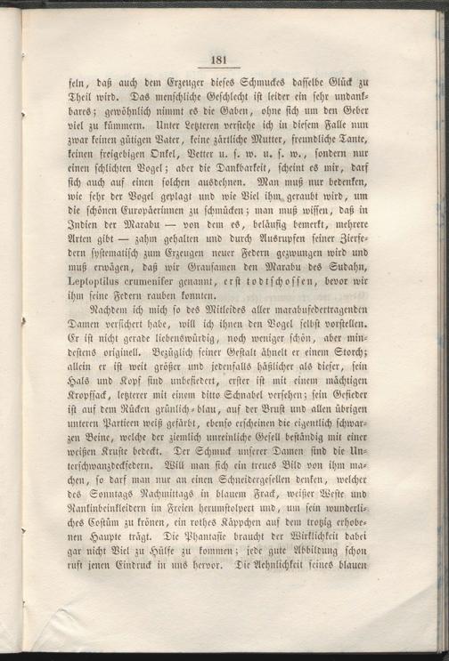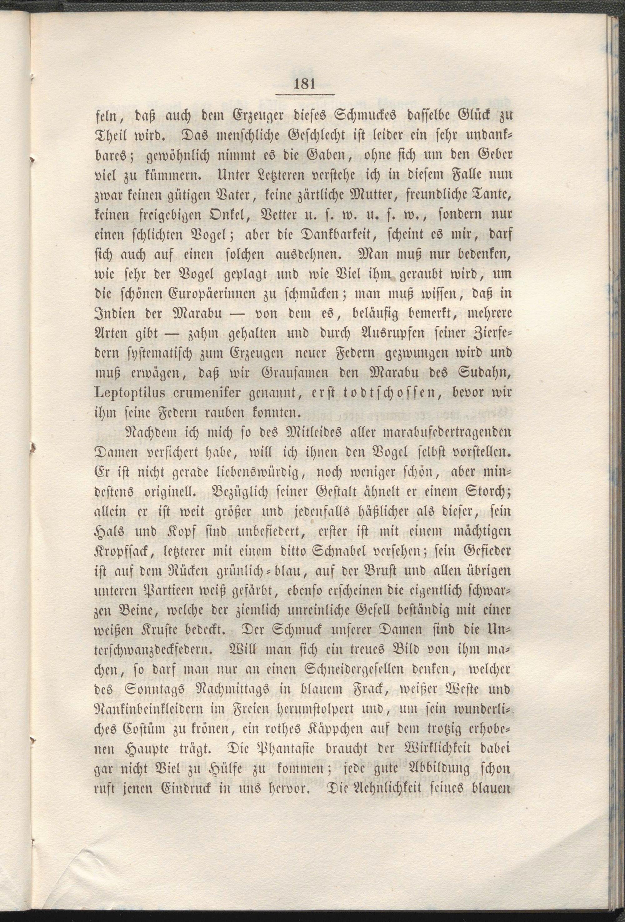 feln, daß auch dcm Erzeuger dieses Schmuckes dasselbe Glück zu Theil wird. Das menschliche Geschlecht ist leider ein sehr undankbares; gewöhnlich nimmt es die Gaben, ohne sich um den Geber viel zu kümmern. Unter Letzteren verstehe ich in diesem Falle nun zwar keinen gütigen Vater, keine zärtliche Mutter, freundliche Tante, keinen freigebigen Onkel, Vetter u. s. w. u. s. w., sondern nur einen schlichten Vogel; aber die Dankbarkeit, scheint es mir, darf sich auch auf einen solchen ausdehnen. Man muß nur bedenken, wie sehr der Vogel geplagt und wie Viel ihm geraubt wird, um die schönen Europäerinnen zu schmücken; man muß wissen, daß in Indien der Marabu — von dem es, beläufig bemerkt, mehrere Arten gibt — zahm gehalten und durch Ausrupfen seiner Zierfe- dern systematisch zum Erzeugen neuer Federn gezwungen wird und muß erwägen, daß wir Grausamen den Marabu des Sudahn, Doptoptilus erumonikor genannt, erst todtschossen, bevor wir ihm seine Federn rauben konnten.