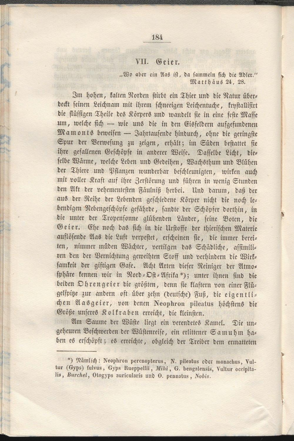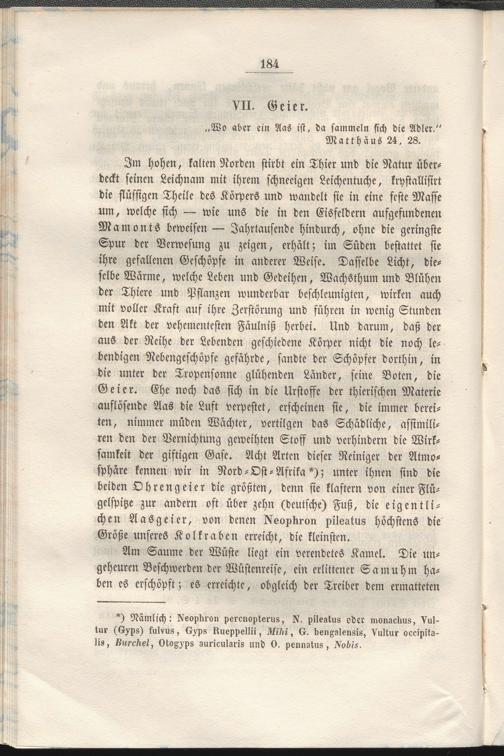 Im hohen, kalten Norden stirbt ein Thier und die Natur überdeckt seinen Leichnam mit ihrem schneeigen Leichcntuche, krystallistrt die flüssigen Theile des Körpers und wandelt sie in eine feste Masse um, welche sich — wie uns die in den Eisfeldern aufgefundenen Mamonts beweisen — Jahrtausende hindurch, ohne die geringste Spur der Verwesung zu zeigen, erhält; im Süden bestattet sie ihre gefallenen Geschöpfe in anderer Weise. Dasselbe Licht, dieselbe Wärme, welche Leben und Gedeihen, Wachsthum und Blühen der Thiere und Pflanzen wunderbar beschleunigten, wirken auch mit voller Kraft auf ihre Zerstörung und führen in wenig Stunden den Akt der vehementesten Fäulniß herbei. Und darum, daß der aus der Reihe der Lebenden geschiedene Körper nicht die noch lebendigen Ncbengcschöpfe gefährde, sandte der Schöpfer dorthin, in die unter der Tropcnsonne glühenden Länder, seine Boten, die Geier. Ehe noch daS sich in die Urstoffe der thierischen Materie auflösende Aas die Luft verpestet, erscheinen sie, die immer bereiten, nimmer müden Wächter, vertilgen das Schädliche, assimili- ren den der Vernichtung geweihten Stoff und verhindern die Wirksamkeit der giftigen Gase. Acht Arten dieser Reiniger der Atmosphäre kennen wir in Nord-Ost-Afrika*); unter ihnen sind die beiden Ohrengeicr die größten, denn sie klaftern von einer Flü- gelspitze zur andern oft über zehn (deutsche) Fuß, die eigentlichen Aasgeier, von denen iVeopllron pileatus höchstens die Größe unseres Kolkraben erreicht, die kleinsten.
