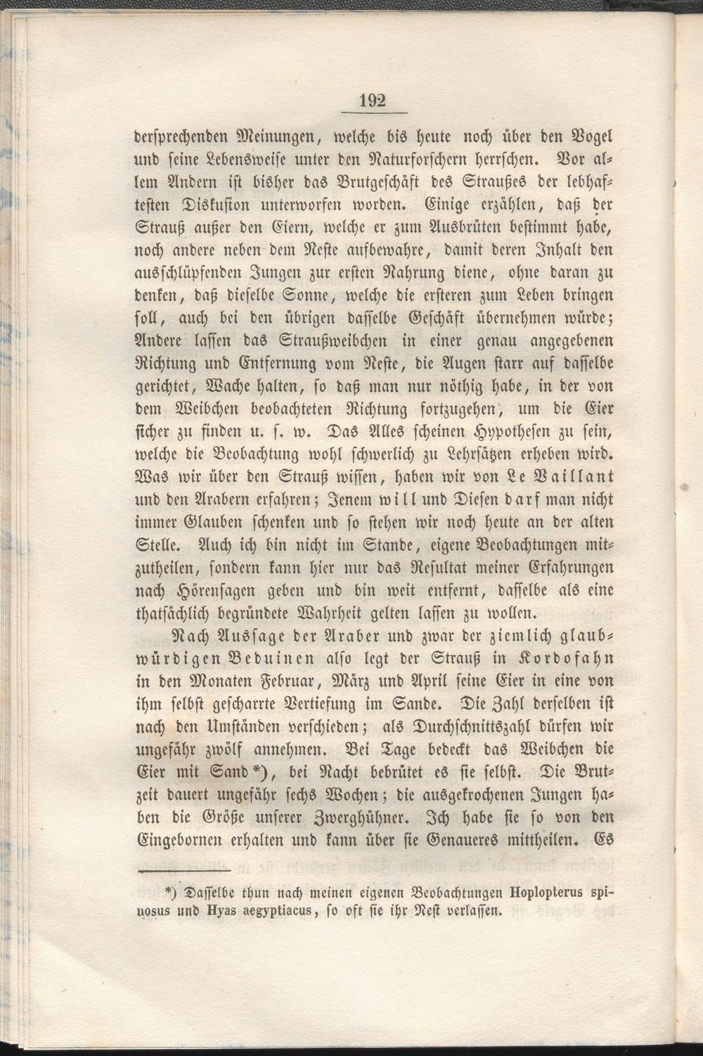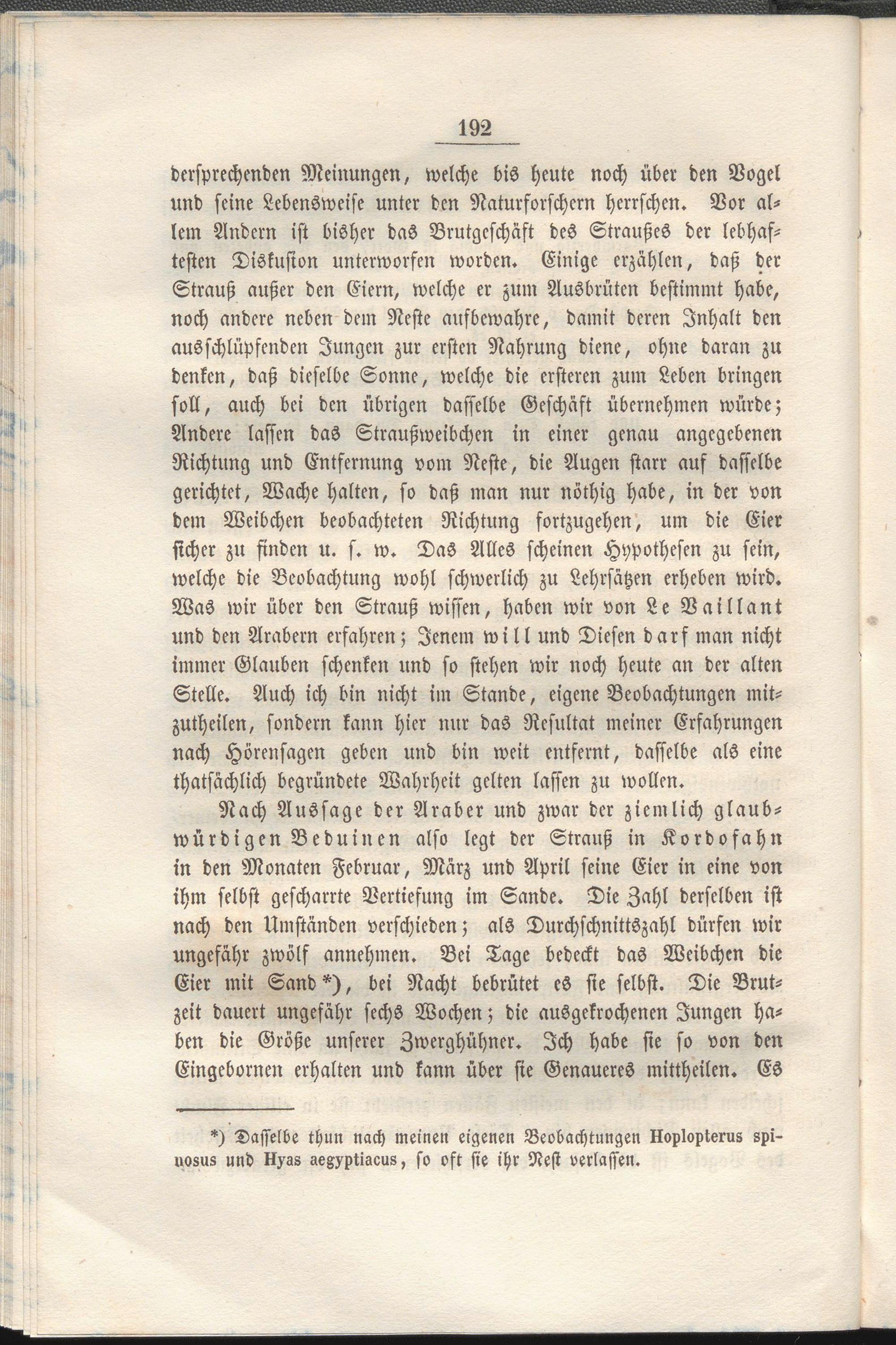 Nach Aussage der Araber und zwar der ziemlich glaubwürdigen Beduinen also legt der Strauß in Kordofahn in den Monaten Februar, März und April seine Eier in eine von ihm selbst gescharrte Vertiefung im Sande. Die Zahl derselben ist nach den Umständen verschieden; als Durchschnittszahl dürfen wir ungefähr zwölf annehmen. Bei Tage bedeckt das Weibchen die Eier mit Sand*), bei Nacht bebrütet es sie selbst. Die Brutzeit dauert ungefähr sechs Wochen; die ausgekrochencn Jungen haben die Größe unserer Zwerghühner. Ich habe sie so von den Eingebornen erhalten und kann über sie Genaueres mittheilen. Es