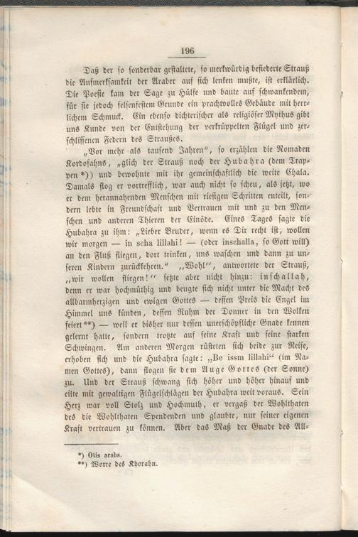 „Vor mehr als tausend Jahren", so erzählen die Nomaden Kordofahns, „glich der Strauß noch der Hubahra (dem Trappen*)) und bewohnte mit ihr gemeinschaftlich die weite Ehala. Damals flog er vortrefflich, war auch nicht so scheu, als jetzt, wo er dem herannahenden Menschen mit riesigen Schritten enteilt, son-' dem lebte in Freundschaft und Vertrauen mit und zu den Menschen und anderen Thieren der Einöde. Eines Tages sagte die Hubahra zu ihm: „Lieber Bruder, wenn es Dir recht ist, wollen wir morgen — in seine lillalii! — (oder inselralla, so Gott will) an den Fluß fliegen, dort trinken, uns waschen und dann zu unseren Kindern zurückkehren." „Wohl", antwortete der Strauß, „wir wollen fliegen!" setzte aber nicht hinzu: inschallah, denn er war hochmüthig und beugte sich nicht unter die Macht dcS allbarmherzigen und ewigen Gottes — dessen Preis die Engel im Himmel uns künden, dessen Ruhm der Donner in den Wolken feiert**) — weil er bisher nur dessen unerschöpfliche Gnade kennen gelernt hatte, sondern trotzte auf seine Kraft und seine starken Schwingen. Am anderen Morgen rüsteten sich beide zur Reise, erhoben sich und die Hubahra sagte: „Ls issm lill-ckri" (im Namen Gottes), dann flogen sie dem Auge Gottes (der Sonne) zu. Und der Strauß schwang sich höher und höher hinauf und eilte mit gewaltigen Flügelschlägen der Hubahra weit voraus. Sein Herz war voll Stolz und Hochmuth, er vergaß der Wohlthaten des die Wohlthaten Spendenden und glaubte, nur seiner eigenen Kraft vertrauen zu können. Aber das Maß der Gnade des All-