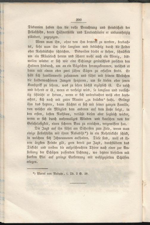Diebereien haben ihm die volle Verachtung und Feindschaft der Fellahhihn, deren Hühnerställe und Taubenhäuser er unbarmherzig plündert, zugezogen.