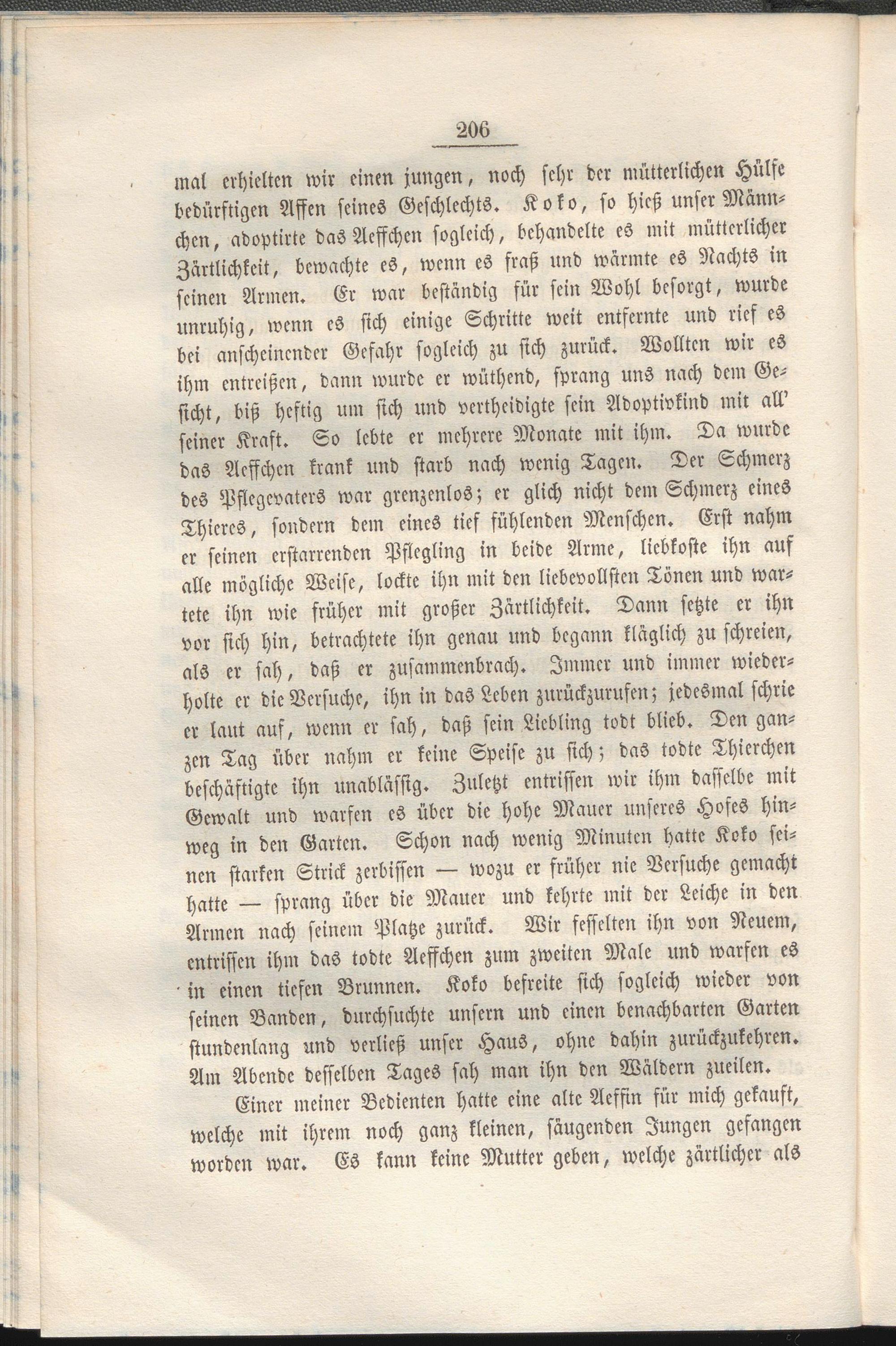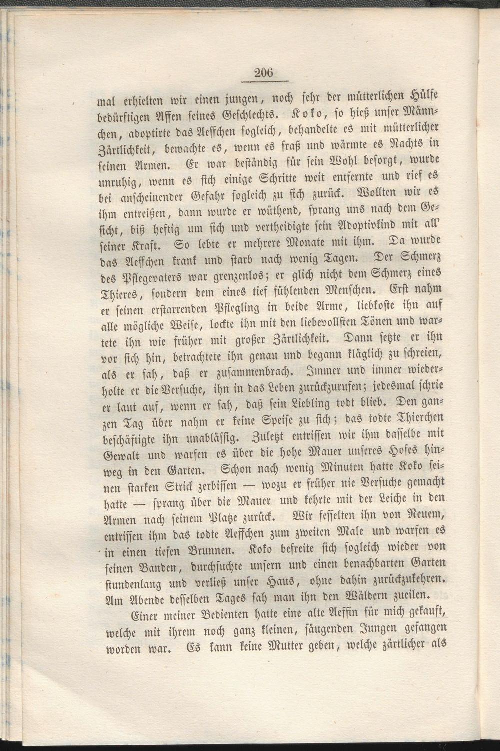 mal erhielten wir einen jungen, noch sehr der mütterlichen Hülfe bedürftigen Affen seines Geschlechts. Koko, so hieß unser Männchen, adoptirte das Acffchcn sogleich, behandelte es mit mütterlicher Zärtlichkeit, bewachte es, wenn es fraß und wärmte es Nachts in seinen Armen. Er war beständig für sein Wohl besorgt, wurde unruhig, wenn es sich einige Schritte weit entfernte und rief es bei anscheinender Gefahr sogleich zu sich zurück. Wollten wir es ihm entreißen, dann wurde er wüthend, sprang uns nach dem Gesicht, biß heftig um sich und vertheidigte sein Adoptivkind mit all' seiner Kraft. So lebte er mehrere Monate mit ihm. Da wurde das Acffchcn krank und starb nach wenig Tagen. Der Schmerz des Pflegevaters war grenzenlos; er glich nicht dem Schmerz eines Thieres, sondern dem eines tief fühlenden Menschen. Erst nahm er seinen erstarrenden Pflegling in beide Arme, liebkoste ihn auf alle mögliche Weise, lockte ihn mit den liebevollsten Tönen und wartete ihn wie früher mit großer Zärtlichkeit. Dann setzte er ihn vor sich hin, betrachtete ihn genau und begann kläglich zu schreien, als er sah, daß er zusammenbrach. Immer und immer wiederholte er die Versuche, ihn in das Leben zurückzurufen; jedesmal schrie er laut auf, wenn er sah, daß sein Liebling todt blieb. Den ganzen Tag über nahm er keine Speise zu sich; das todte Thicrchen beschäftigte ihn unablässig. Zuletzt entrissen wir ihm dasselbe mit Gewalt und warfen es über die hohe Mauer unseres Hofes hinweg in den Garten. Schon nach wenig Minuten hatte Koko seinen starken Strick zerbissen — wozu er früher nie Versuche gemacht hatte — sprang über die Mauer und kehrte mit der Leiche in den Armen nach seinem Platze zurück. Wir fesselten ihn von Neuem, entrissen ihm das todte Aeffchen zum zweiten Male und warfen es in einen tiefen Brunnen. Koko befreite sich sogleich wieder von seinen Banden, durchsuchte unsern und einen benachbarten Garten stundenlang und verließ unser Haus, ohne dahin zurückzukehren. Am Abende desselben Tages sah man ihn den Wäldern zueilen.