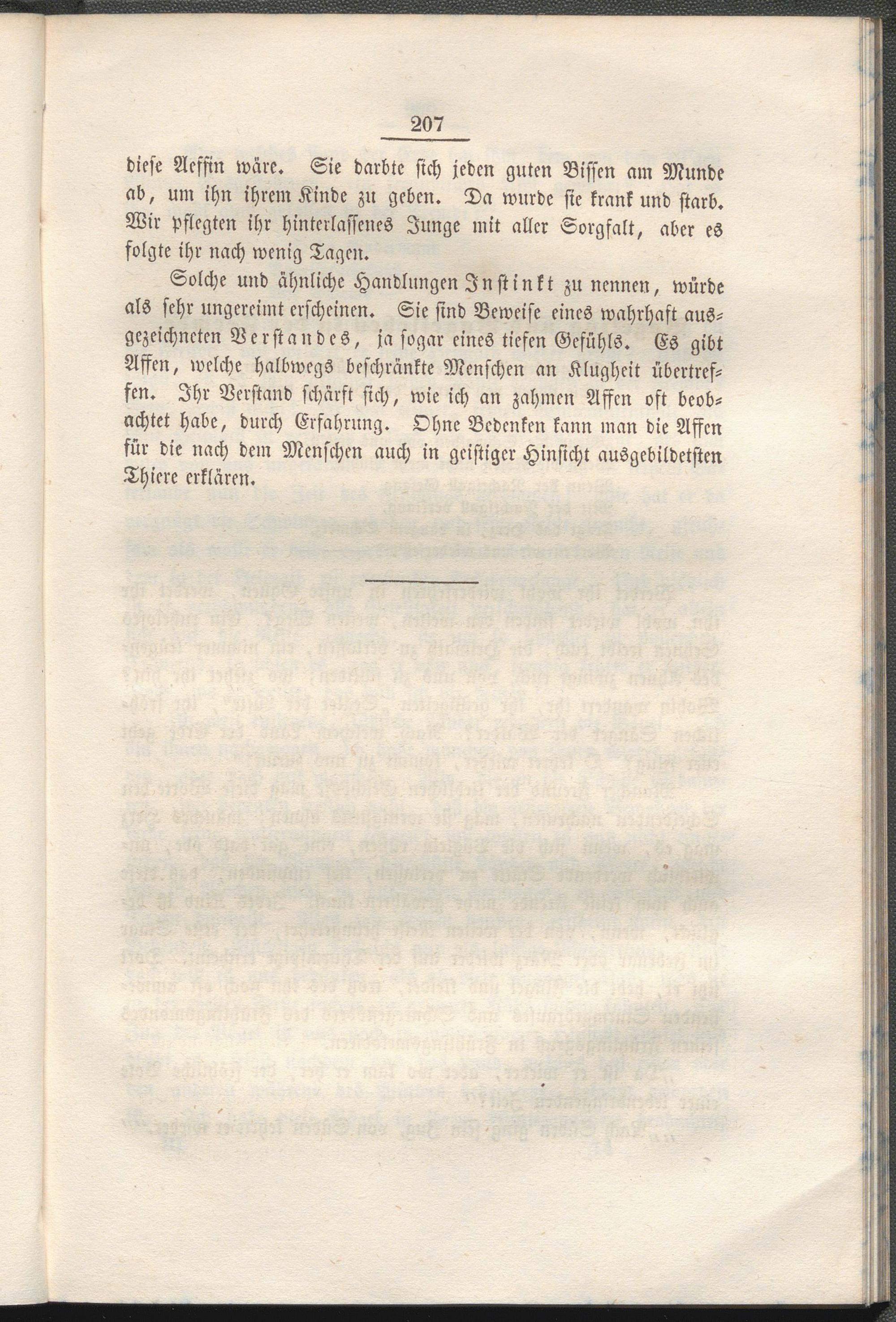 Solche und ähnliche Handlungen Instinkt zu nennen, würde als sehr ungereimt erscheinen. Sie sind Beweise eines wahrhaft ausgezeichneten VerstandeS, ja sogar eines tiefen Gefühls. Es gibt Affen, welche halbwegs beschränkte Menschen an Klugheit übertreffen. Ihr Verstand schärft sich, wie ich an zahmen Affen oft beobachtet habe, durch Erfahrung. Ohne Bedenken kann man die Affen für die nach dem Menschen auch in geistiger Hinsicht ausgebildetsten Thiere erklären.