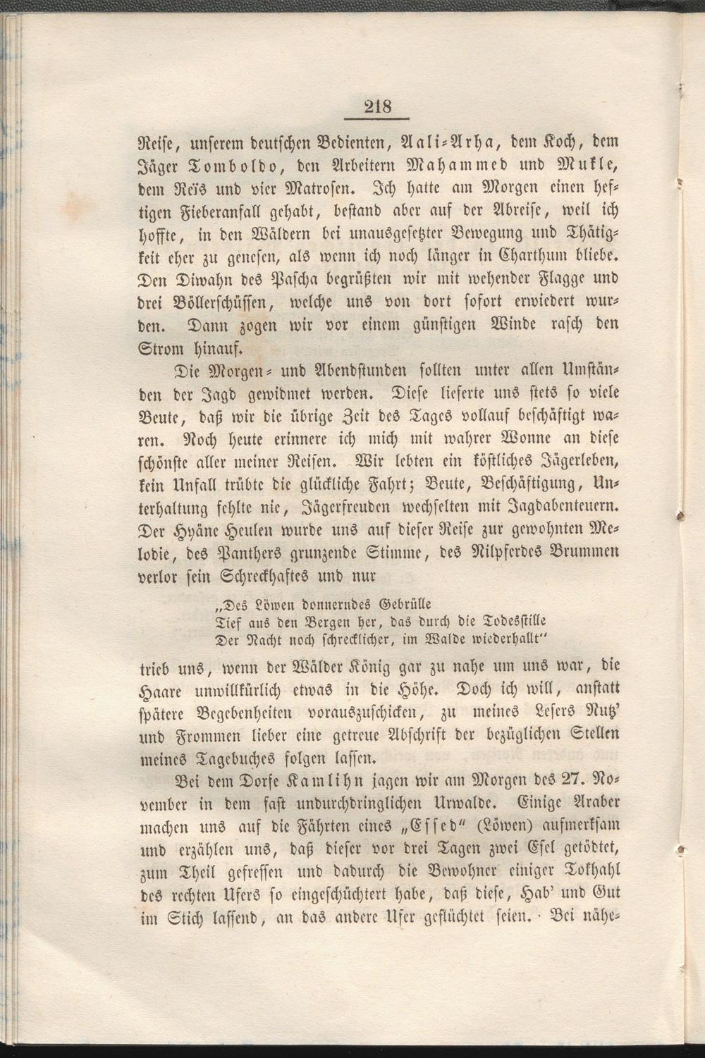 Reise, unserem deutschen Bedienten, Aali-Arha, dem Koch, dem Jäger Tomboldo, den Arbeitern Mähamincd und Mukle, dem Reis und vier Matrosen. Ich hatte am Morgen einen hef- ? tigen Fieberanfall gehabt, bestand aber auf der Abreise, weil ich hoffte, in den Wäldern bei unausgesetzter Bewegung und Thätigkeit eher zu genesen, als wenn ich noch länger in Charthum bliebe.