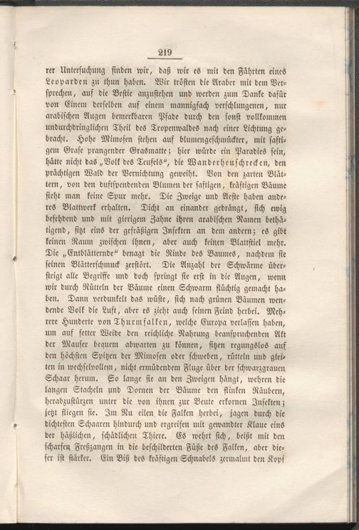 rer Untersuchung finden wir, daß wir es mit den Fährten eines Leoparden zu thun haben. Wir trösten die Araber mit dem Versprechen, auf die Bestie anzustehen und werden zum Danke dafür von Einem derselben auf einem mannigfach verschlungenen, nur arabischen Augen bemerkbaren Pfade durch den sonst vollkommen undurchdringlichen Theil des Tropenwaldes nach einer Lichtung gebracht. Hohe Mimosen stehen auf blumengeschmückter, mit saftigem Grase prangender Grasmatte; hier würde ein Paradies sein, hätte nicht das „Volk des Teufels", die Wanderheuschrecken, den Prächtigen Wald der Vernichtung geweiht. Von den zarten Blättern, von den duflspcndenden Blumen der saftigen, kräftigen Bäume sieht man keine Spur mehr. Die Zweige und Beste haben anderes Blattwerk erhalten. Dicht an einander gedrängt, sich ewig befehdend und mit gierigem Zahne ihren arabischen Namen bethätigend, sitzt eins der gefräßigen Insekten an dem andern; es gibt keinen Raum zwischen ihnen, aber auch keinen Blattstiel mehr. Die „Entblätternde" benagt die Rinde des Baumes, nachdem sie seinen Blätterschmuck zerstört. Die Anzahl der Schwärme übersteigt alle Begriffe und doch springt sie erst in die Augen, wenn wir durch Rütteln der Bäume einen Schwärm flüchtig gemacht haben. Dann verdunkelt das wüste, sich nach grünen Bäumen wendende Volk die Luft, aber es zieht auch seinen Feind herbei. Mehrere Hunderte von Thurmfalkcn, welche Europa verlassen haben, um auf fetter Weide den reichliche Nahrung beanspruchenden Akt der Mauser bequem abwarten zu können, sitzen regungslos auf den höchsten Spitzen der Mimosen oder schweben, rütteln und gleiten in wechselvollcm, nicht ermüdendem Fluge über der schwarzgraucn Schaar herum. So lange sie an den Zweigen hängt, wehren die langen Stacheln und Dornen der Bäume den flinken Räubern, herabzustürzen unter die von ihnen zur Beute erkorncn Insekten; jetzt fliegen sie. Im Nu eilen die Falken herbei, jagen durch die dichtesten Schaarcn hindurch und ergreifen mit gewandter Klaue eins der häßlichen, schädlichen Thiere. Es wehrt sich, beißt mit den scharfer; Frcßzangen in die beschilderten Füße des Falken, aber dieser ist stärker. Ein Biß des kräftigen Schnabels zermalmt deir Kopf