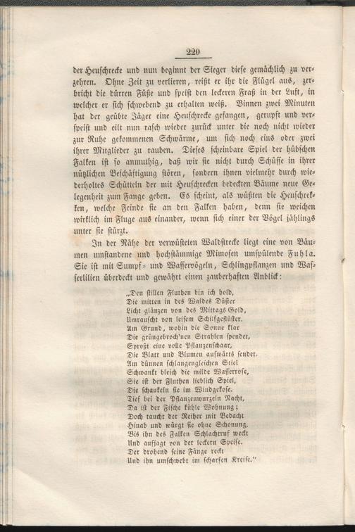 der Heuschrecke und nun beginnt der Sieger diese gemächlich zu verzehren. Ohne Zeit zu verlieren, reißt er ihr die Flügel aus, zerbricht die dürren Füße und speist den leckeren Fraß in der Lust, in welcher er sich schwebend zu erhalten weiß. Binnen zwei Minuten hat der geübte Jäger eine Heuschrecke gefangen, gerupft und verspeist und eilt nun rasch wieder zurück unter die noch nicht wieder zur Ruhe gekommenen Schwärme, um sich noch eins oder zwei ihrer Mitglieder zu rauben. Dieses scheinbare Spiel der hübschen Falken ist so anmuthig, daß wir sie nicht durch Schüsse in ihrer nützlichen Beschäftigung stören, sondern ihnen vielmehr durch wiederholtes Schütteln der mit Heuschrecken bedeckten Bäume neue Gelegenheit zum Fange geben. Es scheint, als wüßten die Hcuschrek-