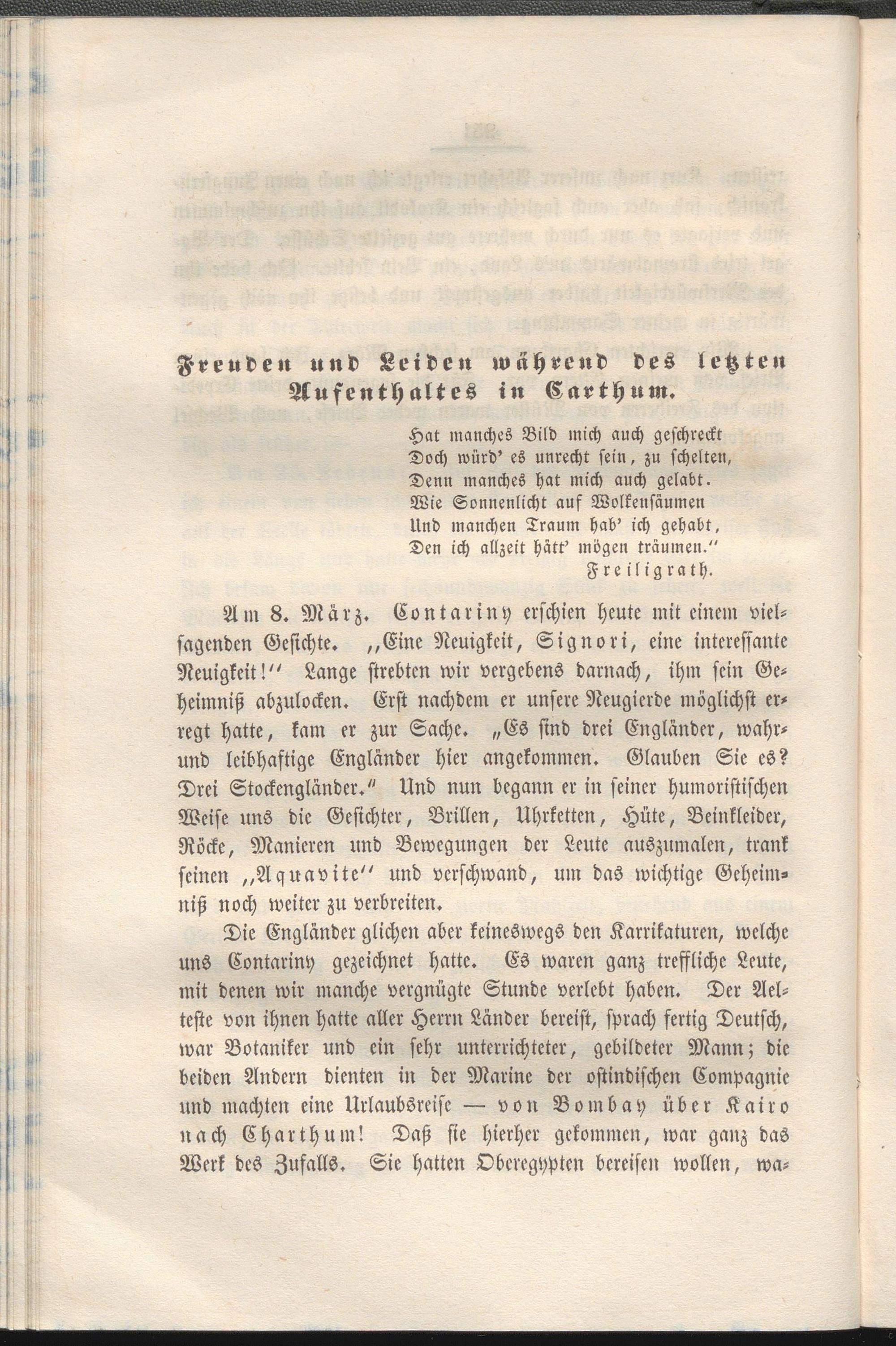 Die Engländer glichen aber keineswegs den Karrikaturen, welche uns Contariny gezeichnet hatte. Es waren ganz treffliche Leute, mit denen wir manche vergnügte Stunde verlebt haben. Der Ael- teste von ihnen hatte aller Herrn Länder bereist, sprach fertig Deutsch, war Botaniker und ein sehr unterrichteter, gebildeter Mann; die beiden Andern dienten in der Marine der ostindischen Compagnie und machten eine Urlaubsreife — von Bombay über Kairo nach Charthum! Daß sie hierher gekommen, war ganz das Werk des Zufalls. Sie hatten Oberegypten bereisen wollen, wa-