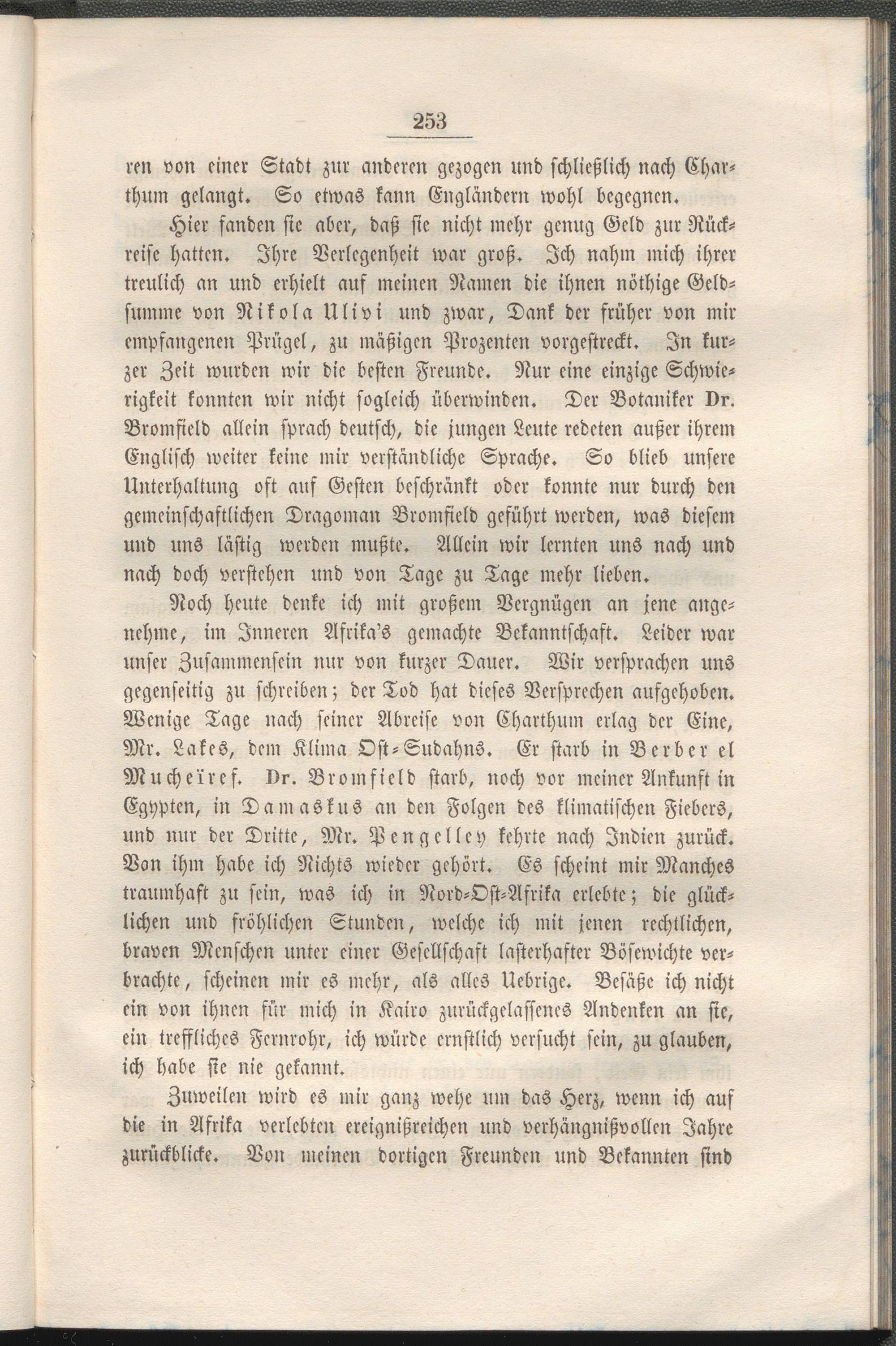 Noch heute denke ich mit großem Vergnügen an jene angenehme, im Inneren Afrika's gemachte Bekanntschaft. Leider war unser Zusammensein nur von kurzer Dauer. Wir versprachen uns gegenseitig zu schreiben; der Tod hat dieses Versprechen aufgehoben. Wenige Tage nach seiner Abreise von Charthum erlag der Eine, Mr. Lakes, dem Klima Ost-Sudahns. Er starb in Berber el Muche'rrcf. Dr. Bromfield starb, noch vor meiner Ankunft in Eghptcn, in Damaskus an den Folgen des klimatischen Fiebers, und nur der Dritte, Mr. Pengcllcy kehrte nach Indien zurück. Von ihm habe ich Nichts wieder gehört. Es scheint mir Manches traumhaft zu sein, was ich in Nord-Ost-Afrika erlebte; die glücklichen und fröhlichen Stunden, welche ich mit jenen rechtlichen, braven Menschen unter einer Gesellschaft lasterhafter Bösewichte verbrachte, scheinen mir es mehr, als alles Uebrigc. Besäße ich nicht ein von ihnen für mich in Kairo zurückgelassenes Andenken an sie, ein treffliches Fernrohr, ich würde ernstlich versucht sein, zu glauben, ich habe sie nie gekannt.