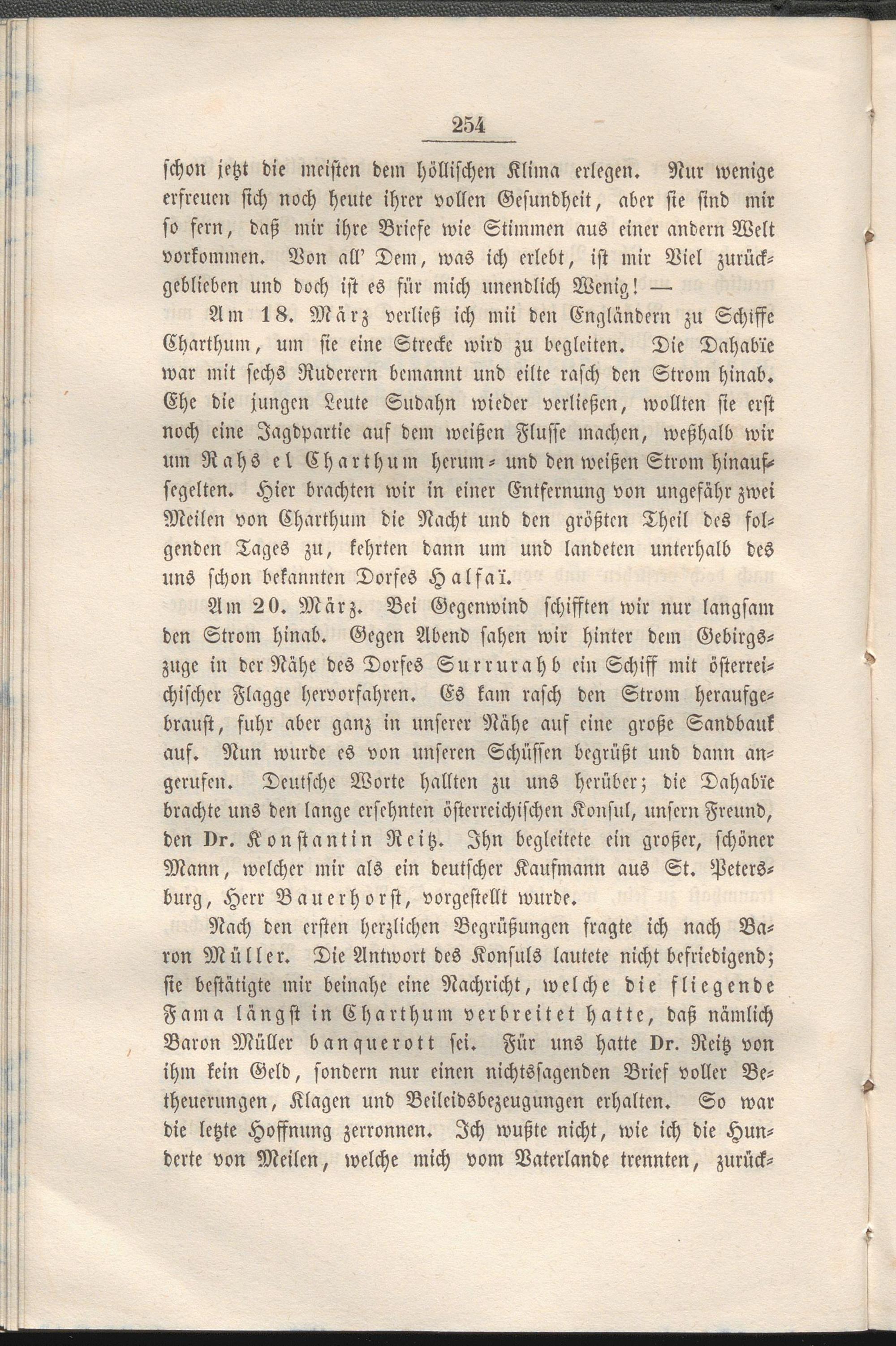 Nach den ersten herzlichen Begrüßungen fragte ich nach Baron Müller. Die Antwort des Konsuls lautete nicht befriedigend; sie bestätigte mir beinahe eine Nachricht, welche die fliegende Fama längst in Charthum verbreitet hatte, daß nämlich Baron Müller banquerott sei. Für uns hatte Dr. Rcitz von ihm kein Geld, sondern nur einen nichtssagenden Brief voller Be- theuerungen, Klagen und Beileidsbezeugungen erhalten. So war die letzte Hoffnung zerronnen. Ich wußte nicht, wie ich die Hunderte von Meilen, welche mich vom Vatcrlande trennten, zurück-