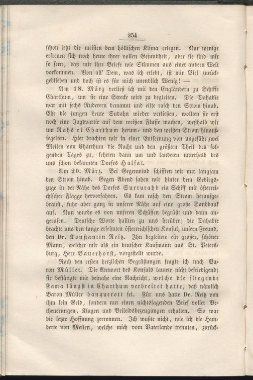 Am 20. März. Bei Gegenwind schifften wir nur langsam den Strom hinab. Gegen Abend sahen wir hinter dem Gebirgs- zugc in der Nähe des Dorfes Surrurah b ein Schiff mit österreichischer Flagge Hervorfahren. Es kam rasch den Strom heraufge- braust, fuhr aber ganz in unserer Nähe auf eine große Sandbauk auf. Nun wurde cS von unseren Schüssen begrüßt und dann angerufen. Deutsche Worte hallten zu uns herüber; die Dahabie brachte uns den lange ersehnten österreichischen Konsul, unsern Freund, den Dr. Konstantin Rcitz. Ihn begleitete ein großer, schöner Mann, welcher mir als ein deutscher Kaufmann aus St. Petersburg, Herr Bauerhorst, vorgestellt wurde.