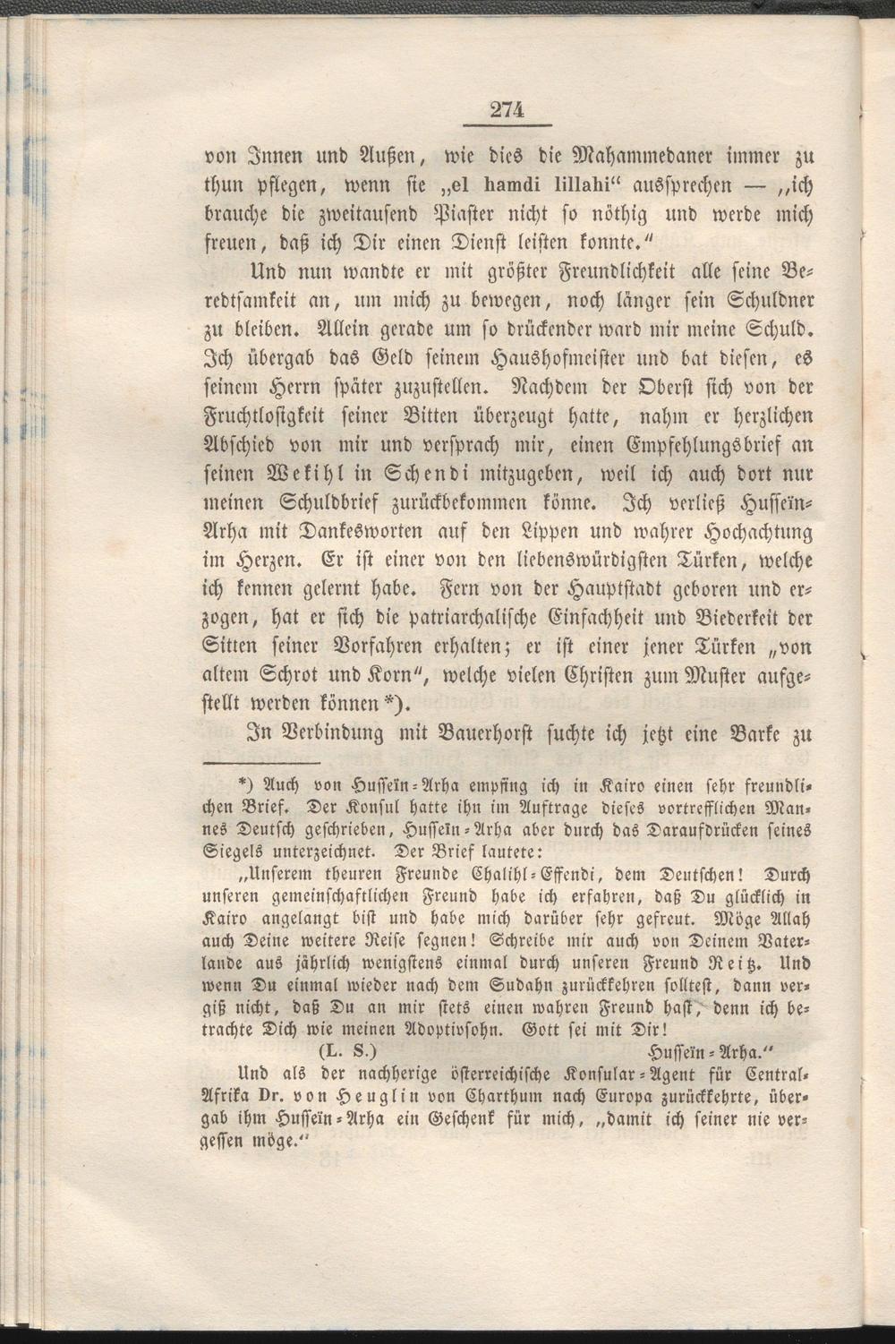 *) Auch von Hussein-Arha empfing ich in Kairo einen sehr freundlichen Brief. Der Konsul hatte ihu im Auftrage dieses vortrefflichen Mannes Deutsch geschrieben, Hussein-Arha aber durch das Daraufdrücken seines Siegeis unterzeichnet. Der Brief lautete: