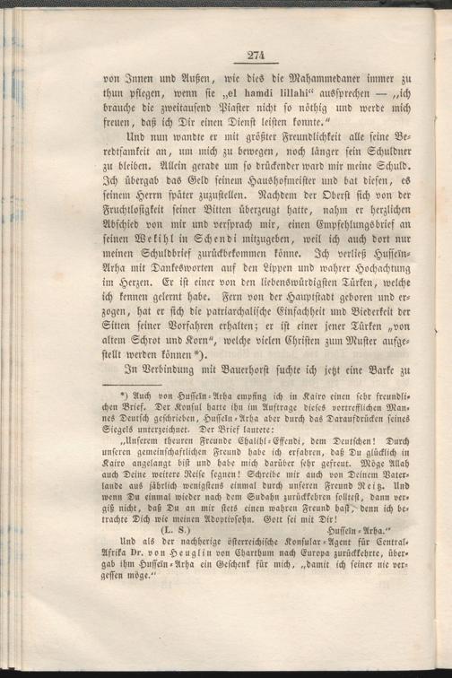 „Unserem theuren Freunde Chalihl-Effendi, dem Deutschen! Durch unseren gemeinschaftlichen Freund habe ich erfahren, daß Du glücklich in Kairo angelangt bist und habe mich darüber sehr gefreut. Möge Allah auch Deine weitere Reise segnen! Schreibe mir auch von Deinem Vaterlande aus jährlich wenigstens einmal durch unseren Freund Reitz. Und wenn Du einmal wieder nach dem Sudahn zurückkehren solltest, dann vergiß nicht, daß Du an mir stets einen wahren Freund hast, denn ich betrachte Dich wie meinen Adoptivsohn. Gott sei mit Dir!