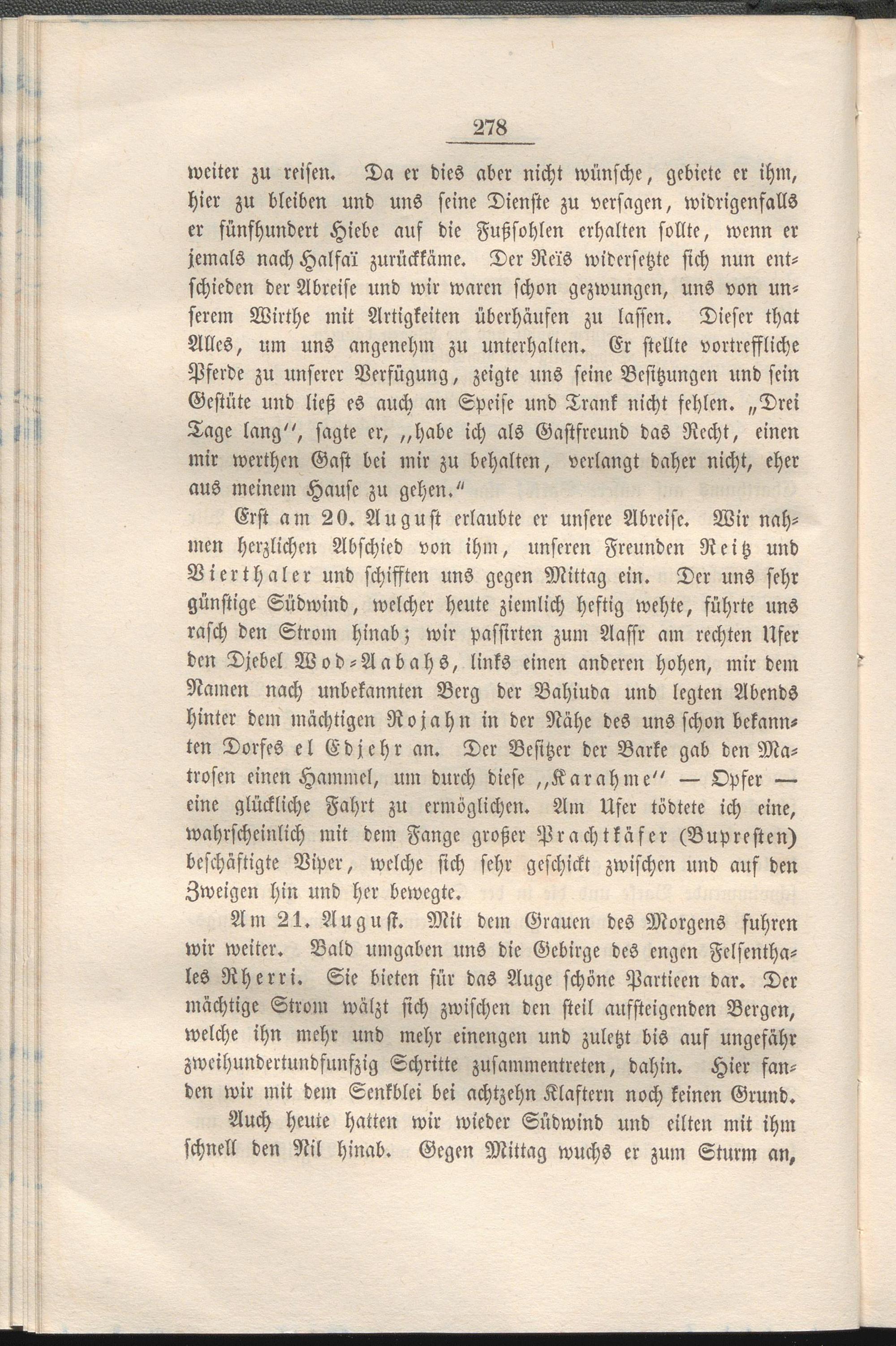 Erst am 20. August erlaubte er unsere Abreise. Wir nahmen herzlichen Abschied von ihm, unseren Freunden Reitz und Vierthaler und schifften uns gegen Mittag ein. Der uns sehr günstige Südwind, welcher heute ziemlich heftig wehte, führte uns rasch den Strom hinab; wir passirtcn zum Aassr am rechten Ufer den Djebel Wod-Aabahs, links einen anderen hohen, mir dem Namen nach unbekannten Berg der Bahiuda und legten Abends hinter dem mächtigen Rojahn in der Nähe des uns schon bekannten Dorfes el Edjehr an. Der Besitzer der Barke gab den Matrosen einen Hammel, um durch diese „Karahme" — Opfer — eine glückliche Fahrt zu ermöglichen. Am Ufer tödtete ich eine, wahrscheinlich mit dem Fange großer Prachtkäfer (Bupresten) beschäftigte Viper, welche sich sehr geschickt zwischen und auf den Zweigen hin und her bewegte.