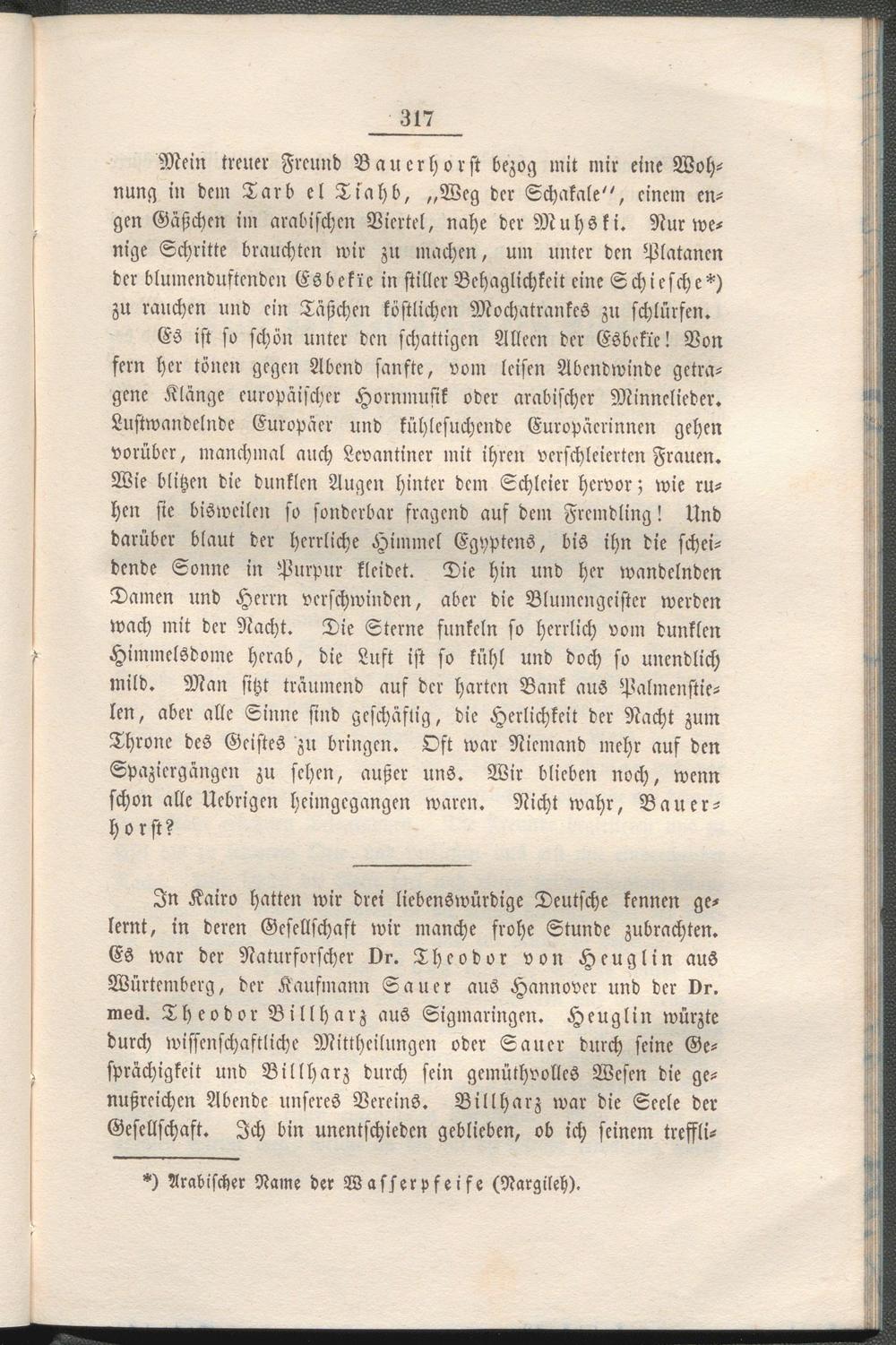 In Kairo hatten wir drei liebenswürdige Deutsche kennen gelernt, in deren Gesellschaft wir manche frohe Stunde zubrachten. Es war der Naturforscher Dr. Theodor von Heuglin aus Würtcmberg, der Kaufmann Sauer aus Hannover und der Dr. meä. Theodor Billharz aus Sigmaringen. Heuglin würzte durch wissenschaftliche Mittheilungen oder Sauer durch seine Gesprächigkeit und Billharz durch sein gcmüthvollcs Wesen die genußreichen Abende unseres Vereins. Billharz war die Seele der Gesellschaft. Ich bin unentschieden geblieben, ob ich seinem treffli-