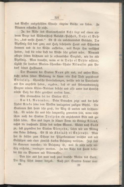 Am 11. November. Beim Erwachen zeigt uns der hohe Djcbel Ataka seine von Wolken umlagerten zackigen Gipfel. Die Stationen sind heute sehr groß, der Weg ist uneben und beschwerlich. Er würde für uns sehr langweilig geworden sein, wenn nicht schon nach der Station Dreizehn ein anziehendes Bild uns gefesselt hätte. Vor uns lagen in blauer Ferne die Gebirge Asiens, rechts die leuchtende Fläche des rothen Meeres. Weiter nach Suös zu, fast gegenüber der Station Vierzehn, sahen wir um Mittag eine kleine Festung. Es ist die Khslsäh el Ädjtzrüht. Man hat sie früher zum Schutze der Pilgcrkarawane errichtet und mit Geschützen und einer ziemlich starken Besatzung versehen. Jetzt sind die Kanonen verrostet; die Besatzung ist, weil sie nicht mehr nöthig erscheint, verringert worden. In der Nähe des Forts befindet sich ein Brunnen mit Bitterwasser.