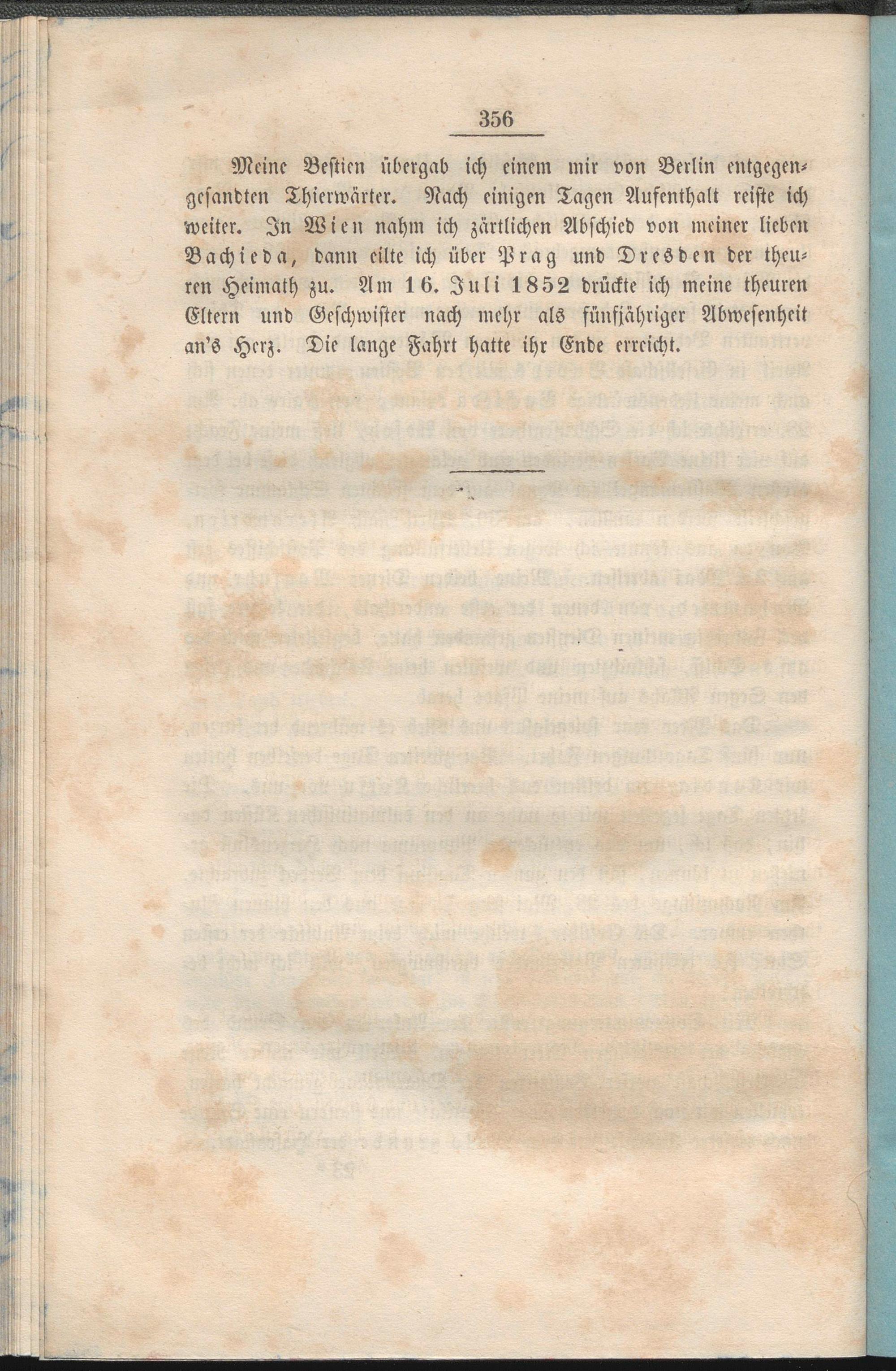 Meine Bestien übergab ich einem mir von Berlin entgegen- gesandten Thierwärter. Nach einigen Tagen Aufenthalt reiste ich weiter. In Wien nahm ich zärtlichen Abschied von meiner lieben Bachieda, dann eilte ich über Prag und DrcSden der theuren Heimath zu. Am 16. Juli 1852 drückte ich meine theuren Eltern und Geschwister nach mehr als fünfjähriger Abwesenheit an'S Herz. Die lange Fahrt hatte ihr Ende erreicht.