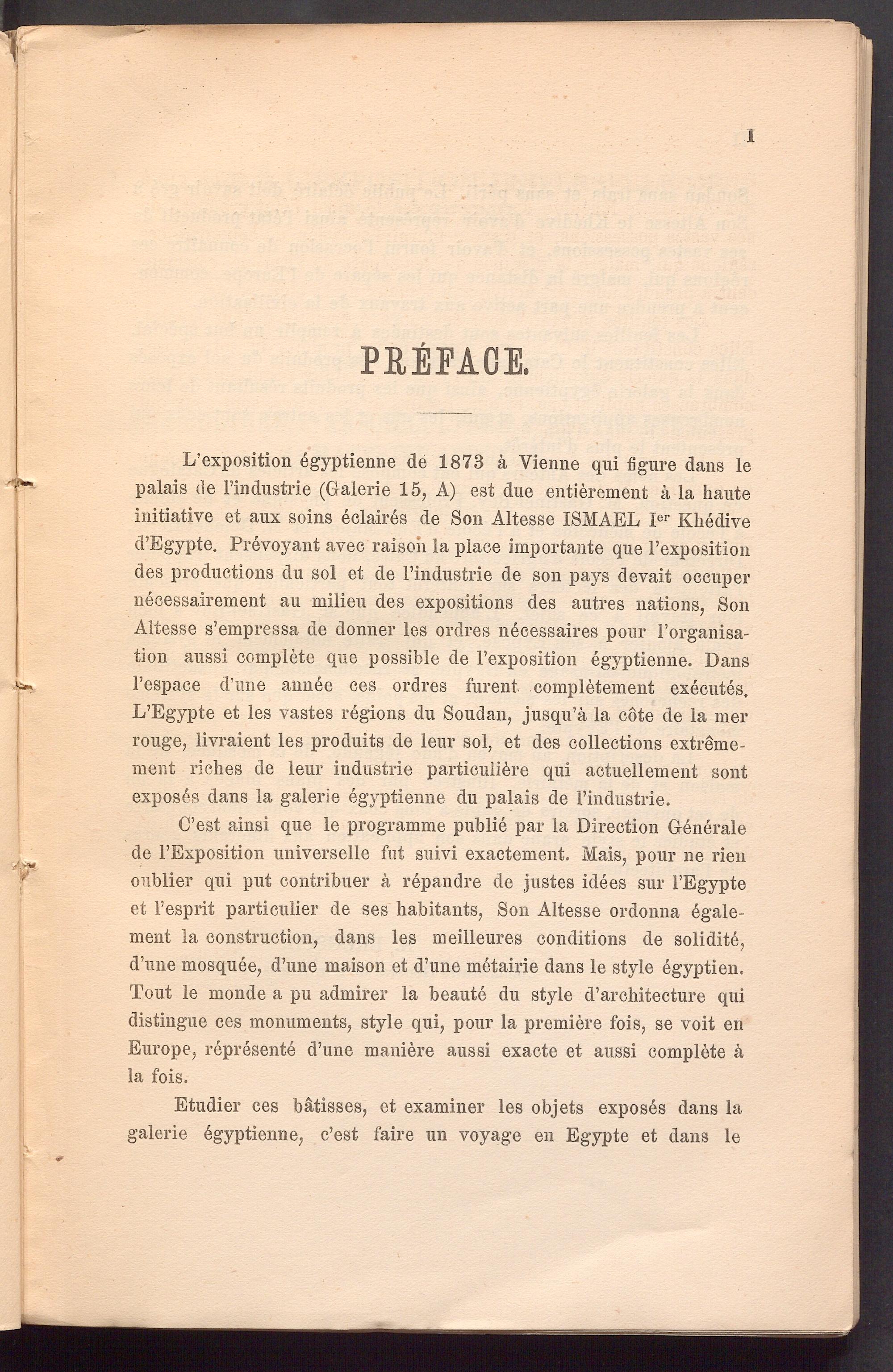L’exposition egyptienne de 1873 ä Vienne qui figure dans le palais de Findustrie (Galerie 15, A) est due entierement ä la haute initiative et aux soins eclaires de Son Altesse ISMAEL I er Khedive d’Egypte. Prevoyant avec raisoii la place importante que l’exposition des productions du sol et de Findustrie de son pays devait occuper necessairement au milieu des expositions des autres nations, Son Altesse s’empressa de donner les ordres necessaires pour l’organisa- tion aussi complete que possible de Fexposition egyptienne. Dans l’espace d’une annee ces ordres furent completement executes. L’Egypte et les vastes regions du Soudan, jusqu’a la cote de la mer rouge, livraient les produits de leur sol, et des collections extreme- ment riches de leur Industrie particuliere qui actuellement sont exposes dans la galerie egyptienne du palais de Findustrie.