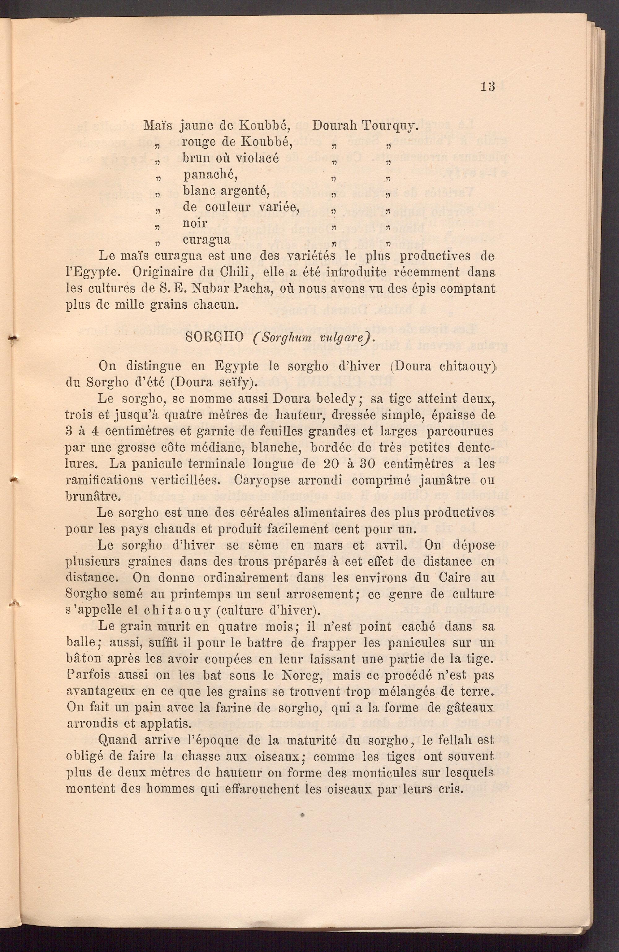Le sorgho d’hiver se seme en mars et avril. On depose plusieurs graines dans des trous prepares ä cet effet de distance en distance. On donne ordinairement dans les environs du Caire au Sorgho seme au printemps un seul arrosement; ce genre de culture s’appelle el chitaouy (culture d’hiver).